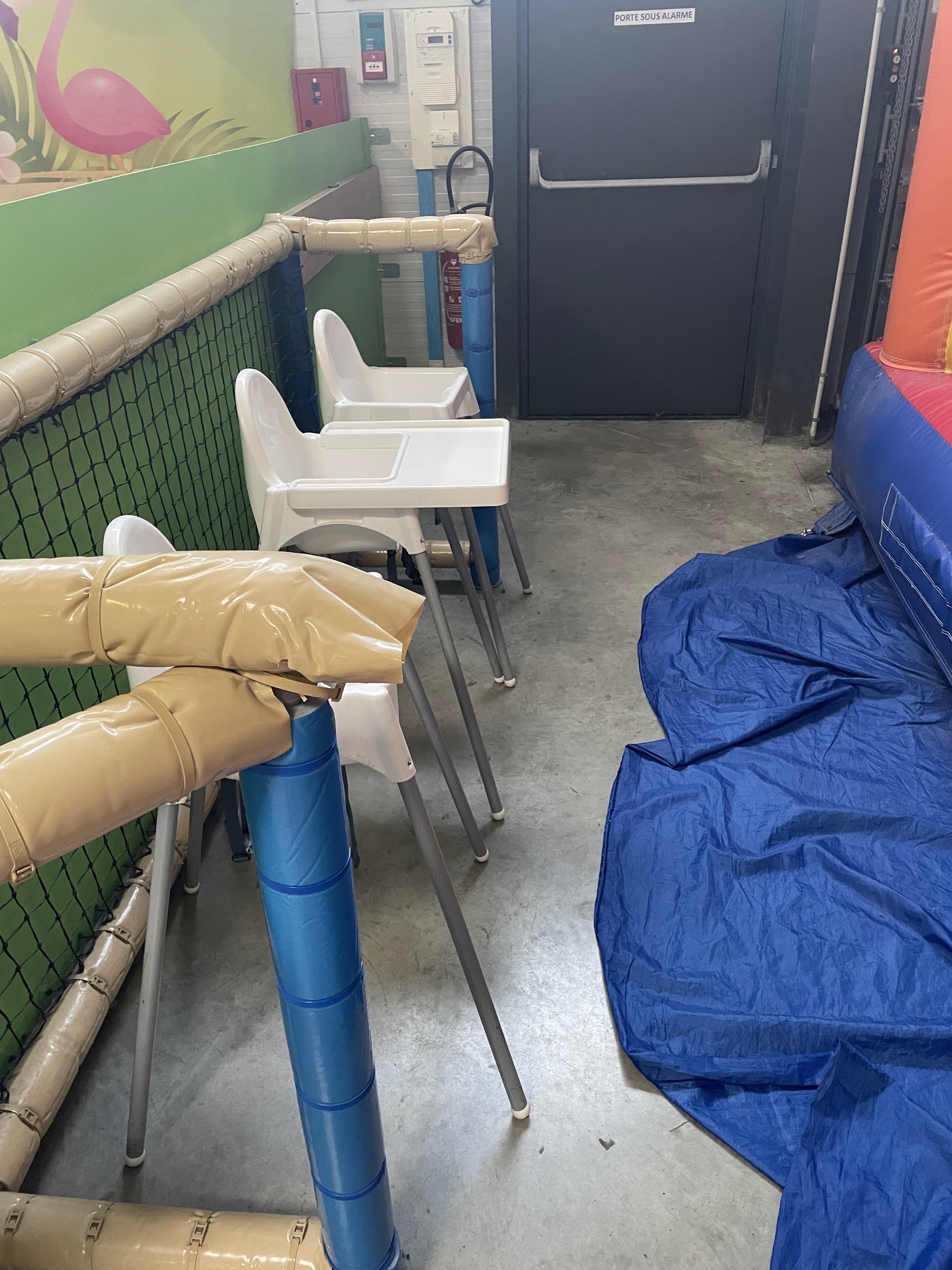Trop glissant sur le beton pour les enfants, beaucoup glissent car pas de tapis mousse pour aller d un jeux à un autre. Jeux trop éparpiller dans le hangar pour surveiller correctement 2 enfants à 2 jeux de coin opposés. Effet sonore plus conséquent. Happy park est beaucoup plus adapté et sécurisant. Dommage mais à revoir la conception