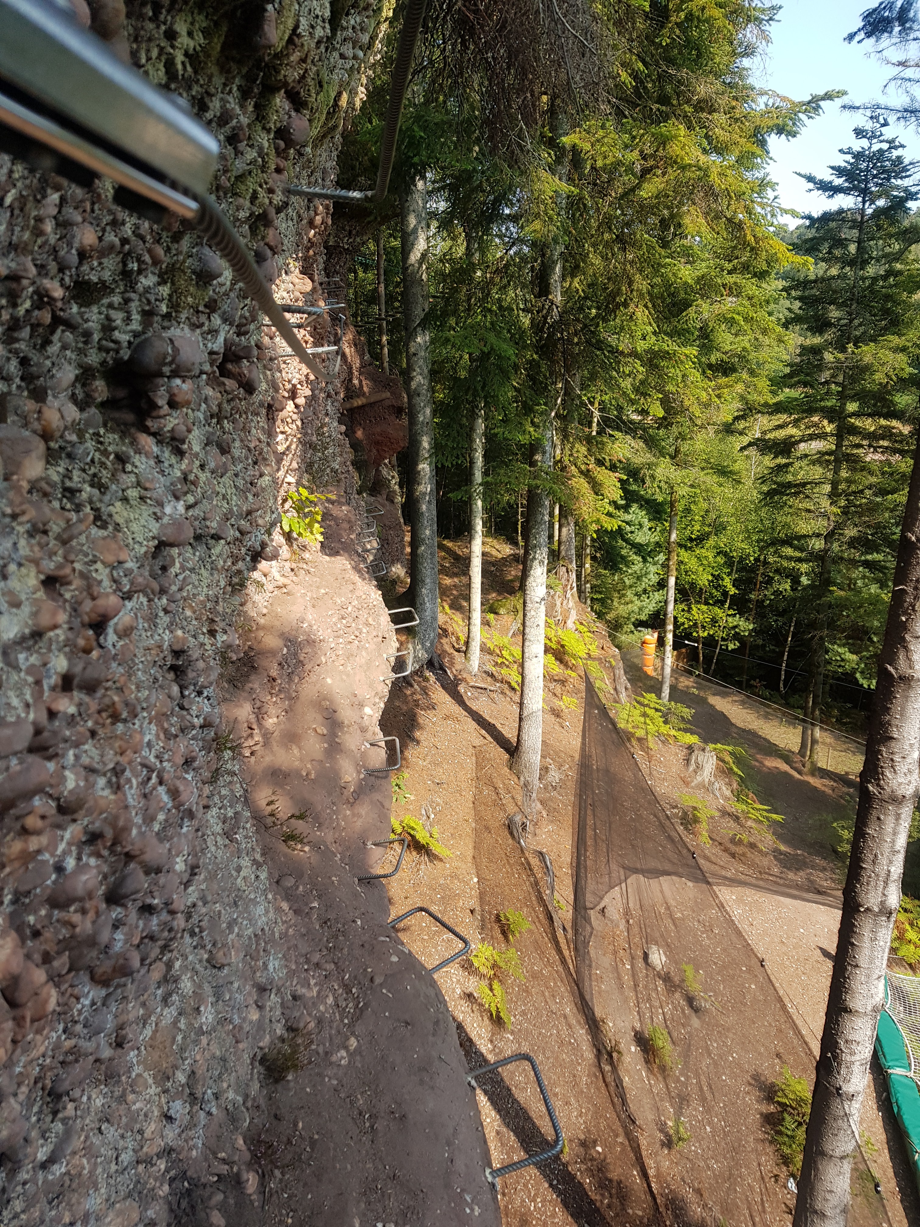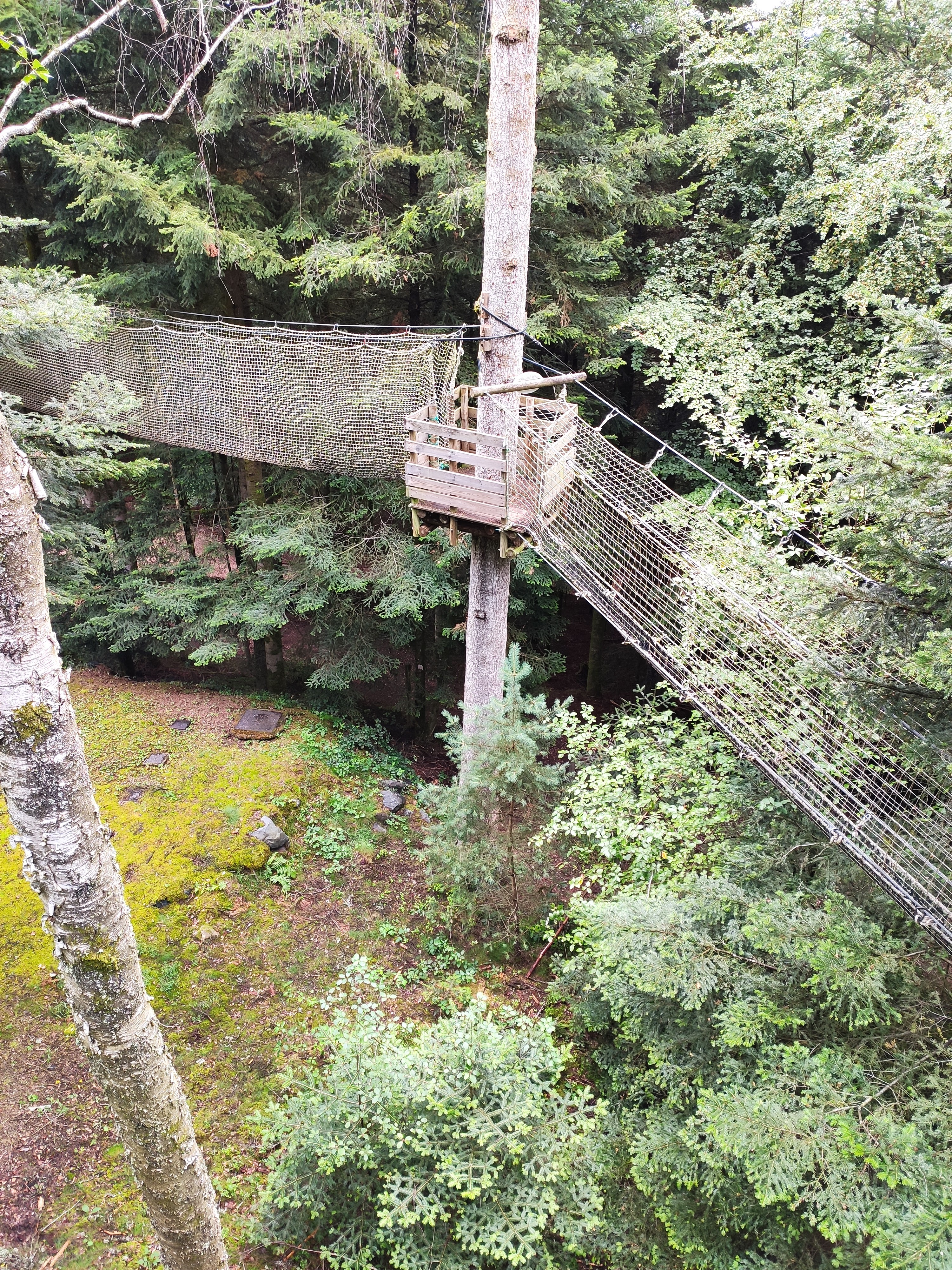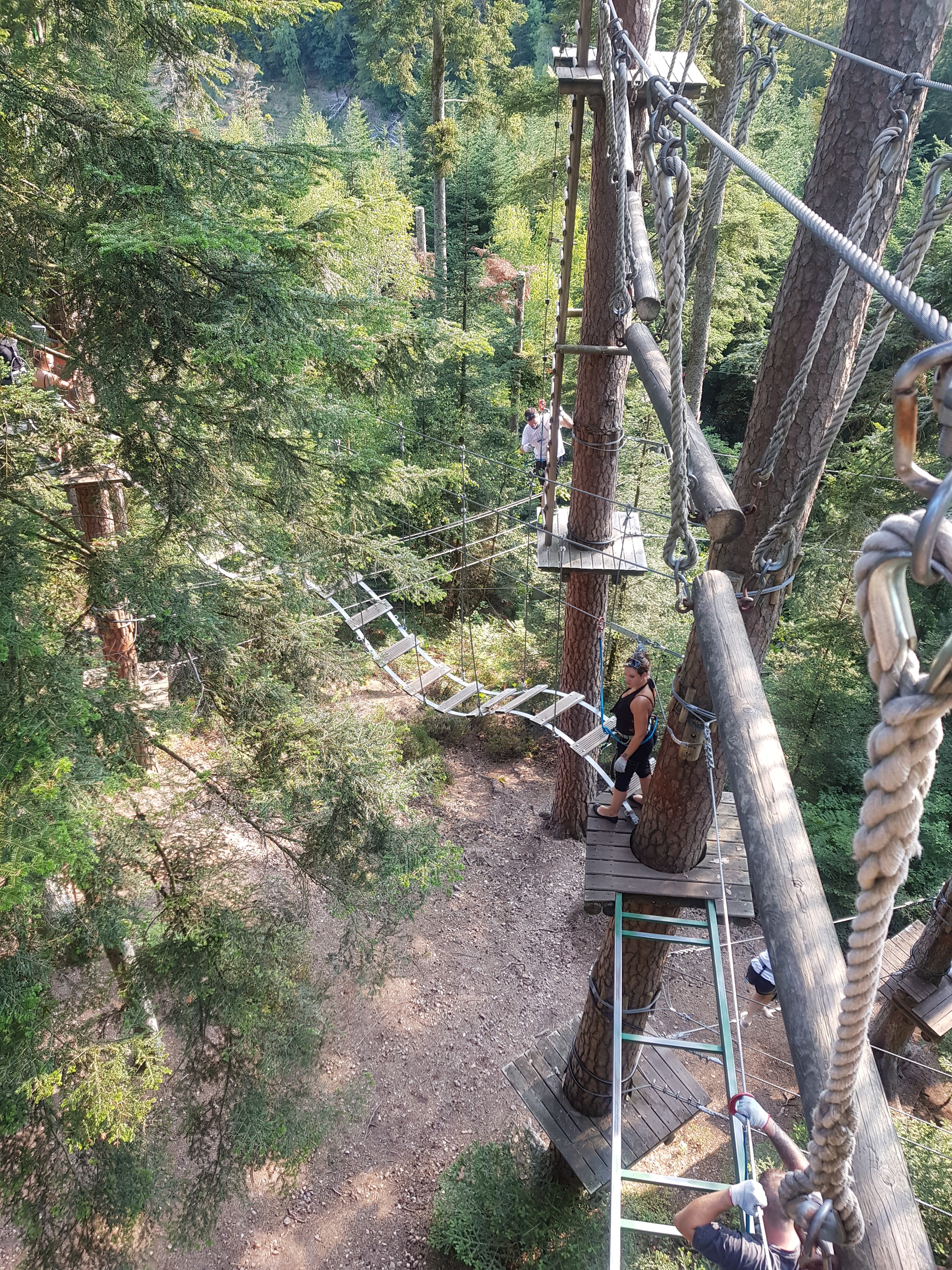 Nous avons pris la formule total sensations à 28€ avec les parcours illimitées + le tyrolcable au dessus du lac. Au niveau des parcours j’ai trouvé qu’ils étaient assez mal indiqués. Lorsque vous en avez fini un vous retombez forcément autre part et il est un peu difficile de se repérer et savoir lesquels ont été fait ou pas. Il y’a beaucoup de parcours mais ils sont assez courts (pour un rouge il faut compter 10 minutes environ). Le seul long parcours est l’unique noir. Par contre nous n’avons pas eu le temps de faire celui de la roche des corbeaux qui avait l’air assez sympa le long de la roche. Ensuite nous avons fait le tyrolcable. Pour cette activité rien à redire c’était vraiment génial. Cela ne dure pas longtemps mais la vue lors de la descente est exceptionnelle. Cela ne fait pas peur mais cela provoque une belle sensation de bonheur, je vous le conseille. Même les tous petits le font !