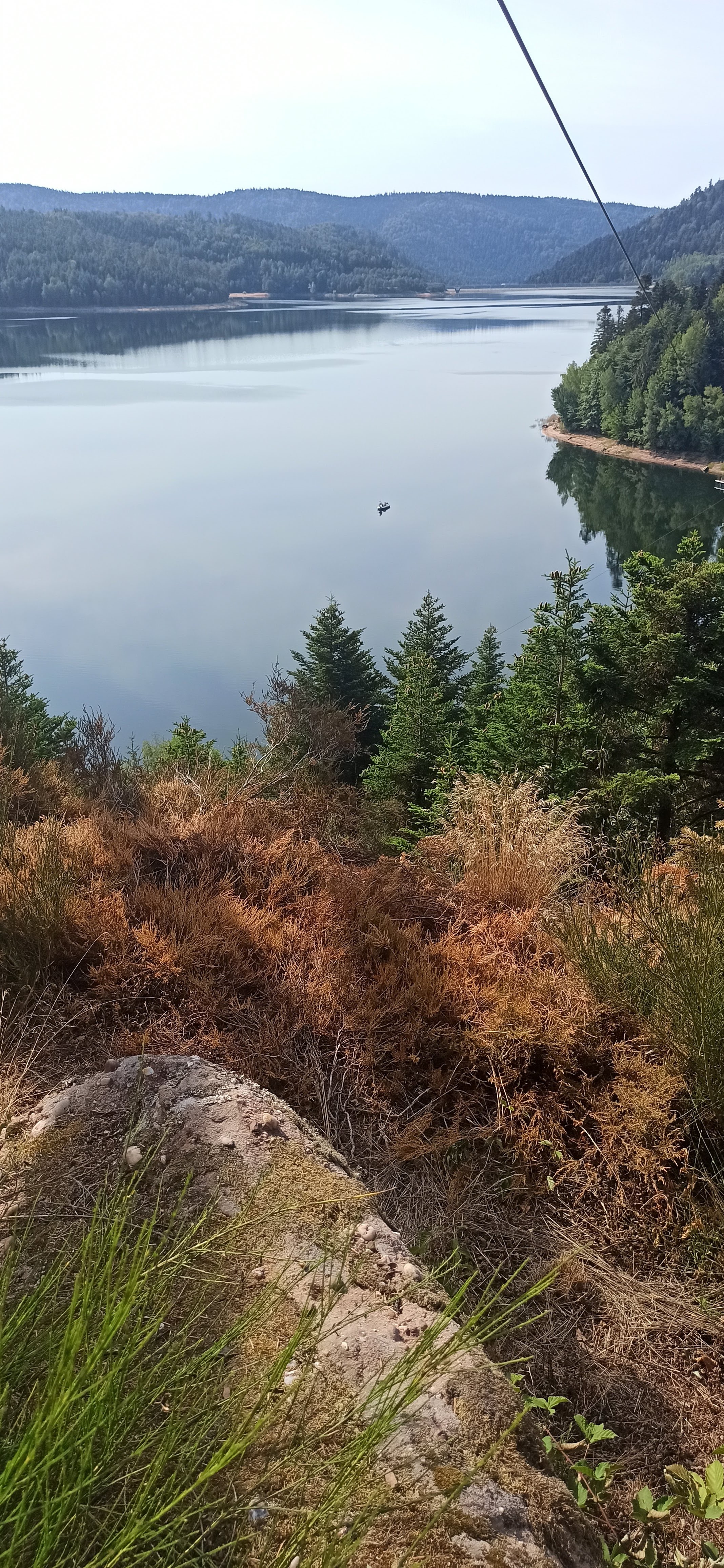 Joli point de vue sur le lac de Pierre-Percée. Le parc aventure occupe la presque totalité du sommet. Pour les amateurs de sensations fortes, une tyrolienne y est installée.