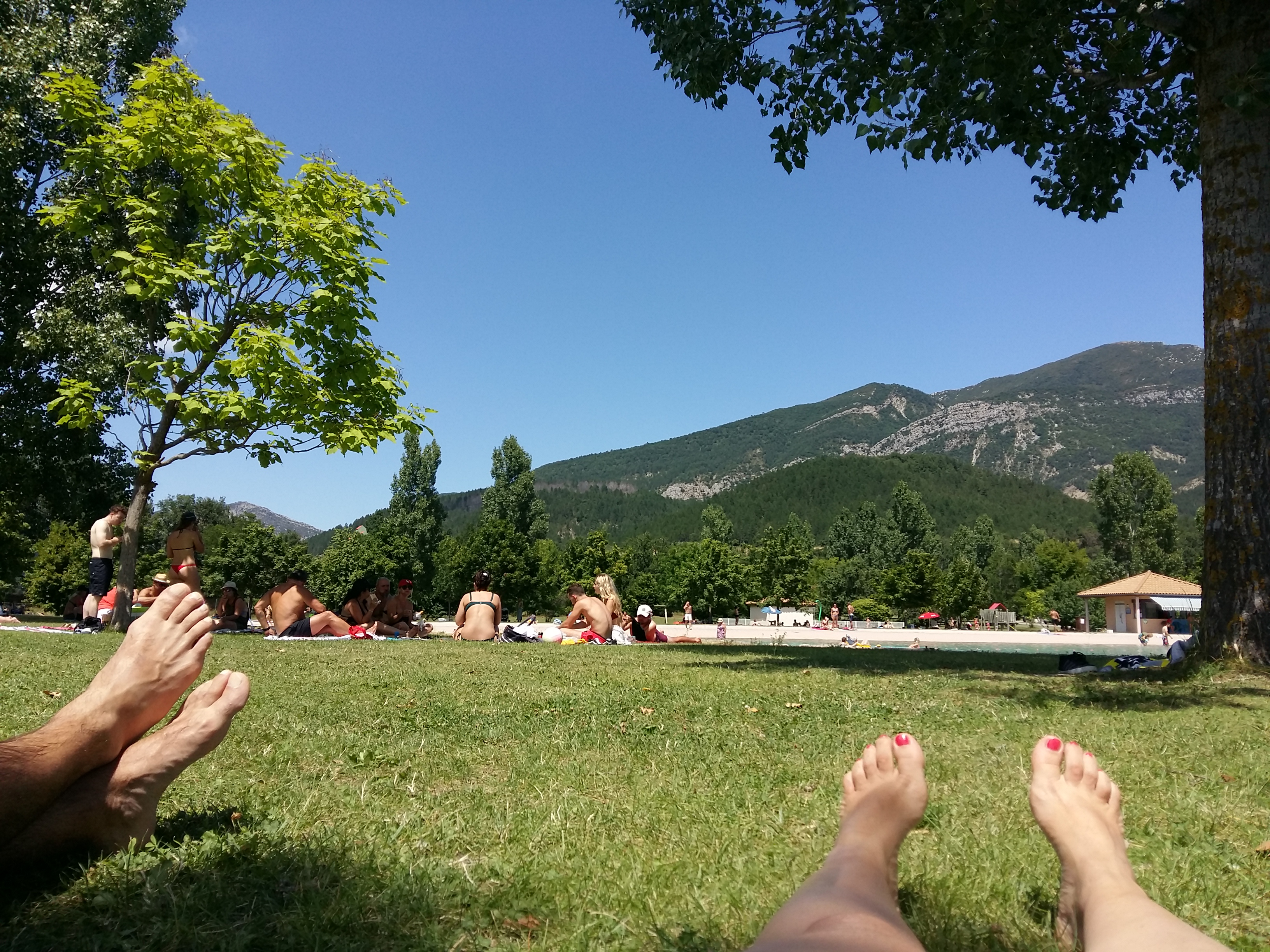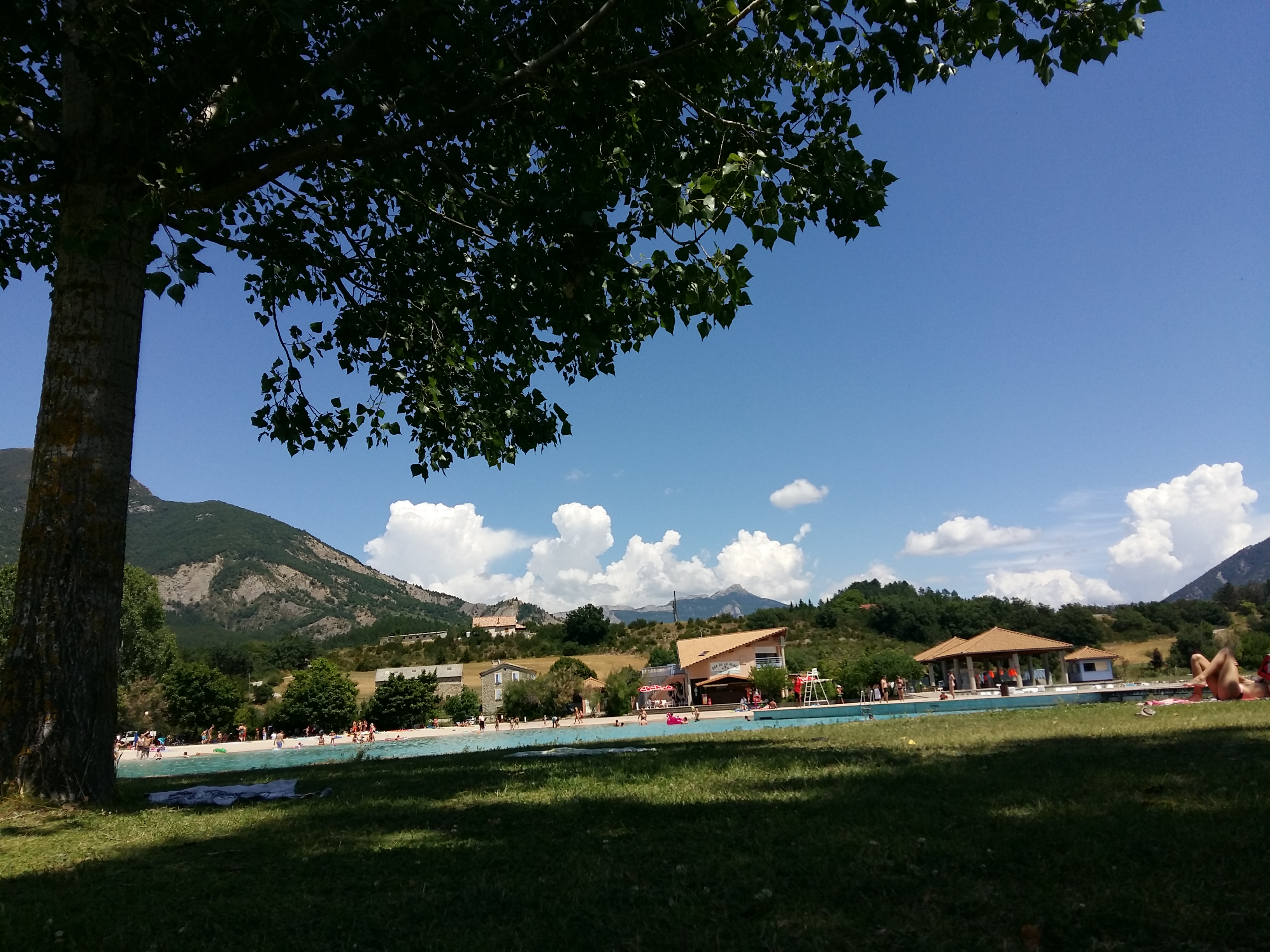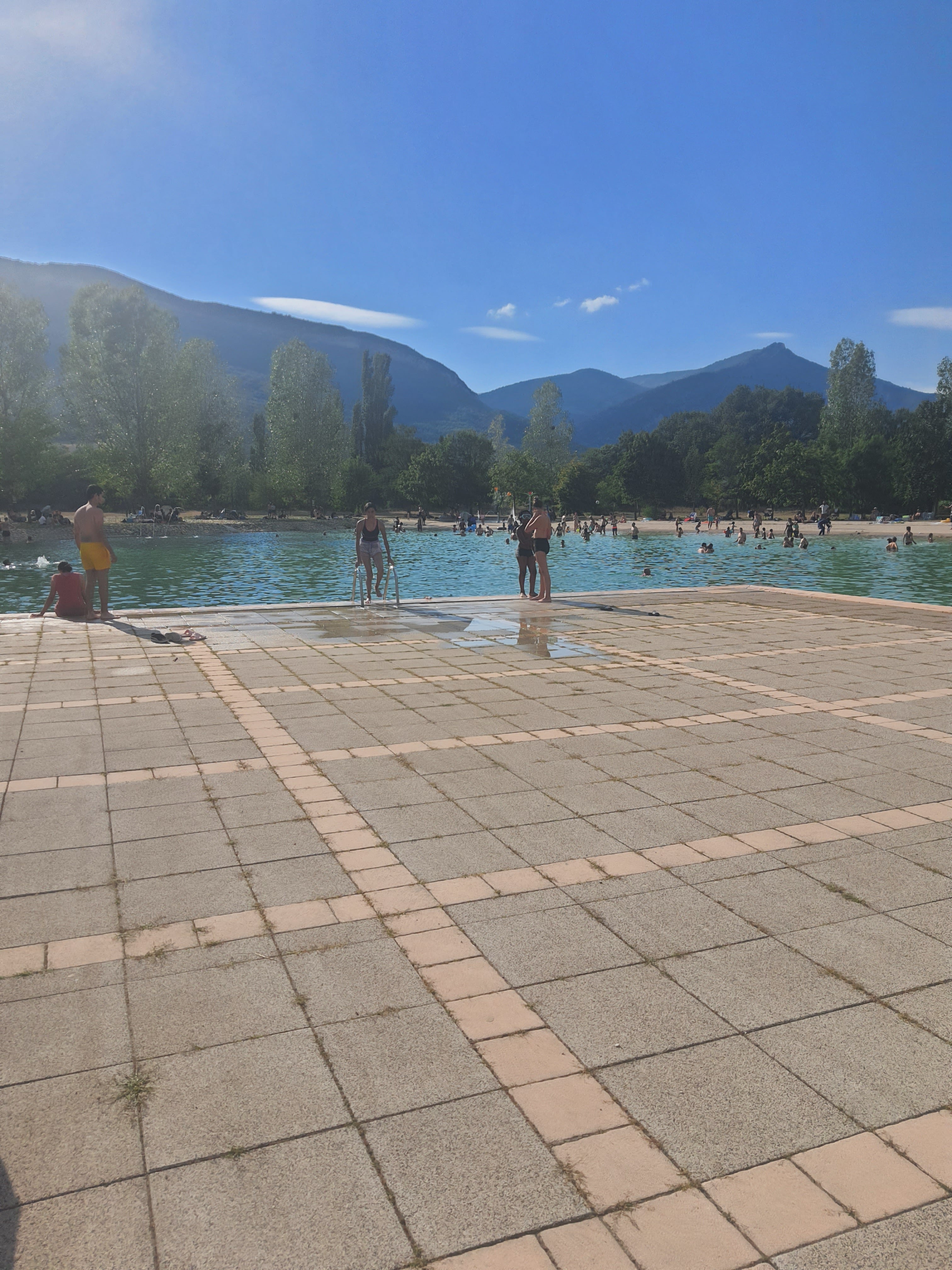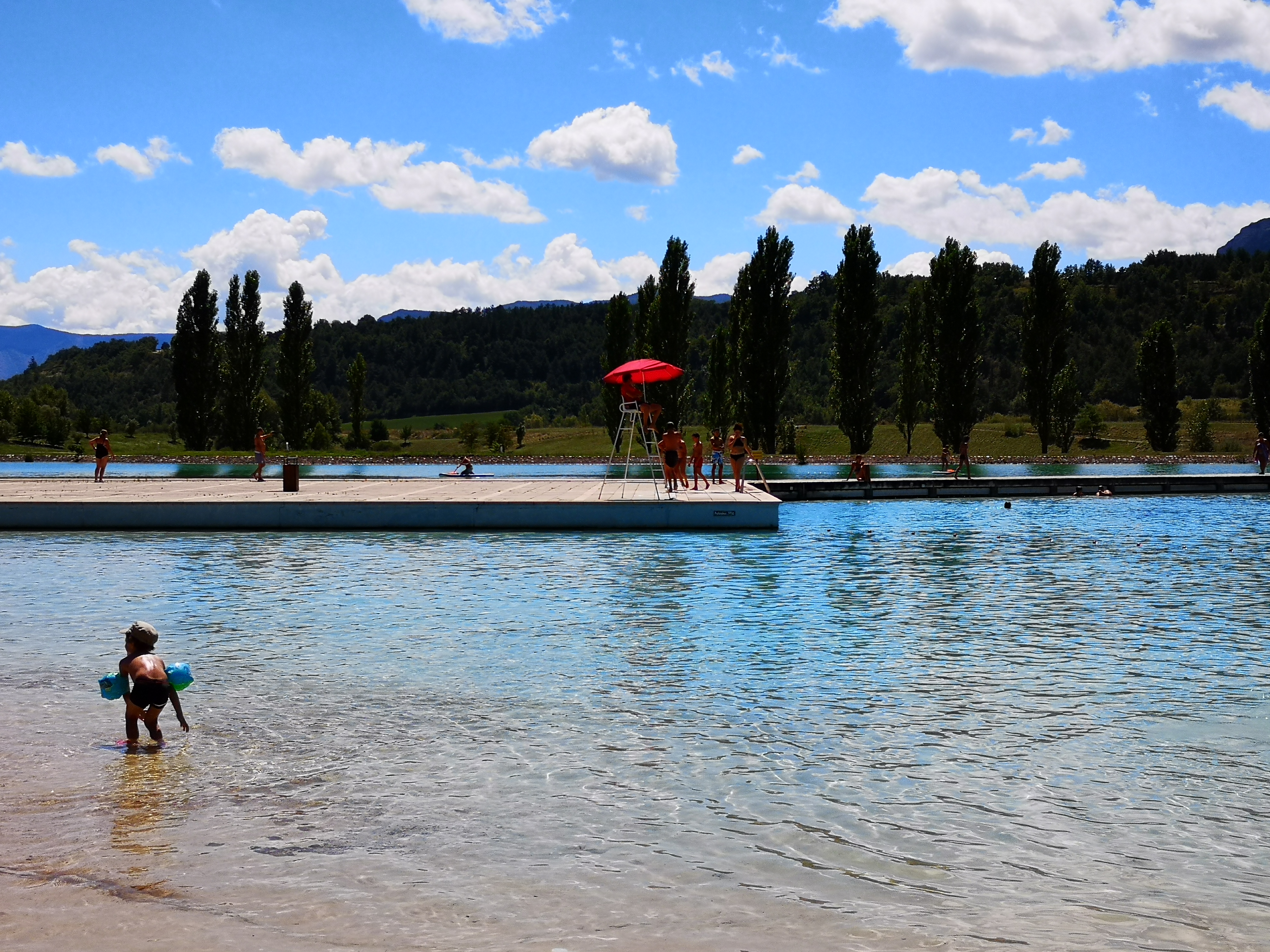 J'adore cet endroit. Comme au milieu de nulle part, protégé par les montagnes, on a cette impression d'être seul au monde tout en étant entourée de plein de gens. Une drôle de sensation mais ô combien plaisante. Plage de gazon, d'asphalte ou de pierres, à l'ombre d'un arbre ou d'un parasol ; barbecue, pique-nique traditionnelle ou même restaurant-buvette ; eau chlorée ou naturelle ; vous n'aurez que l'embarras du choix. Repos, dépaysement et farniente sont au rendez-vous !
