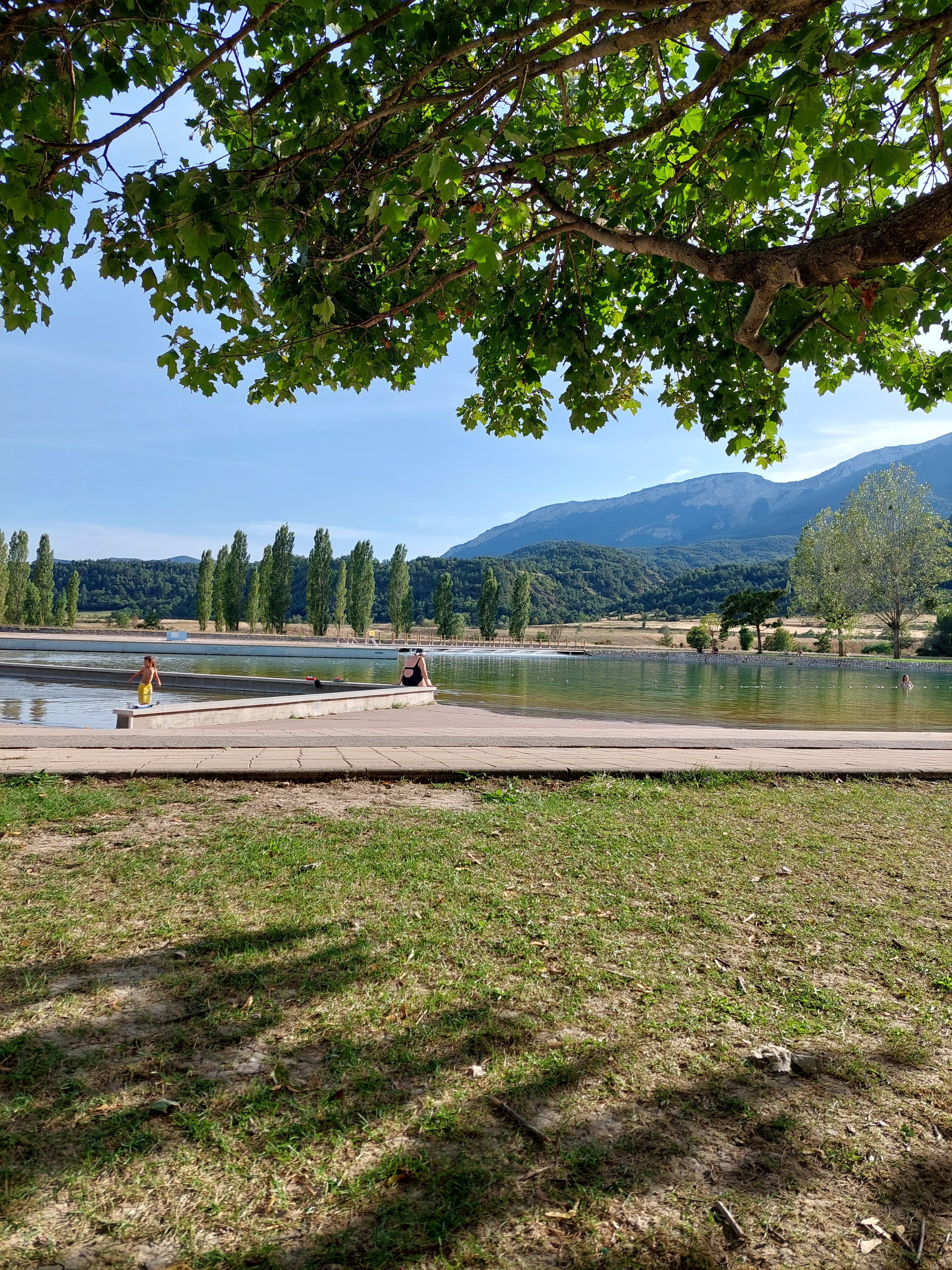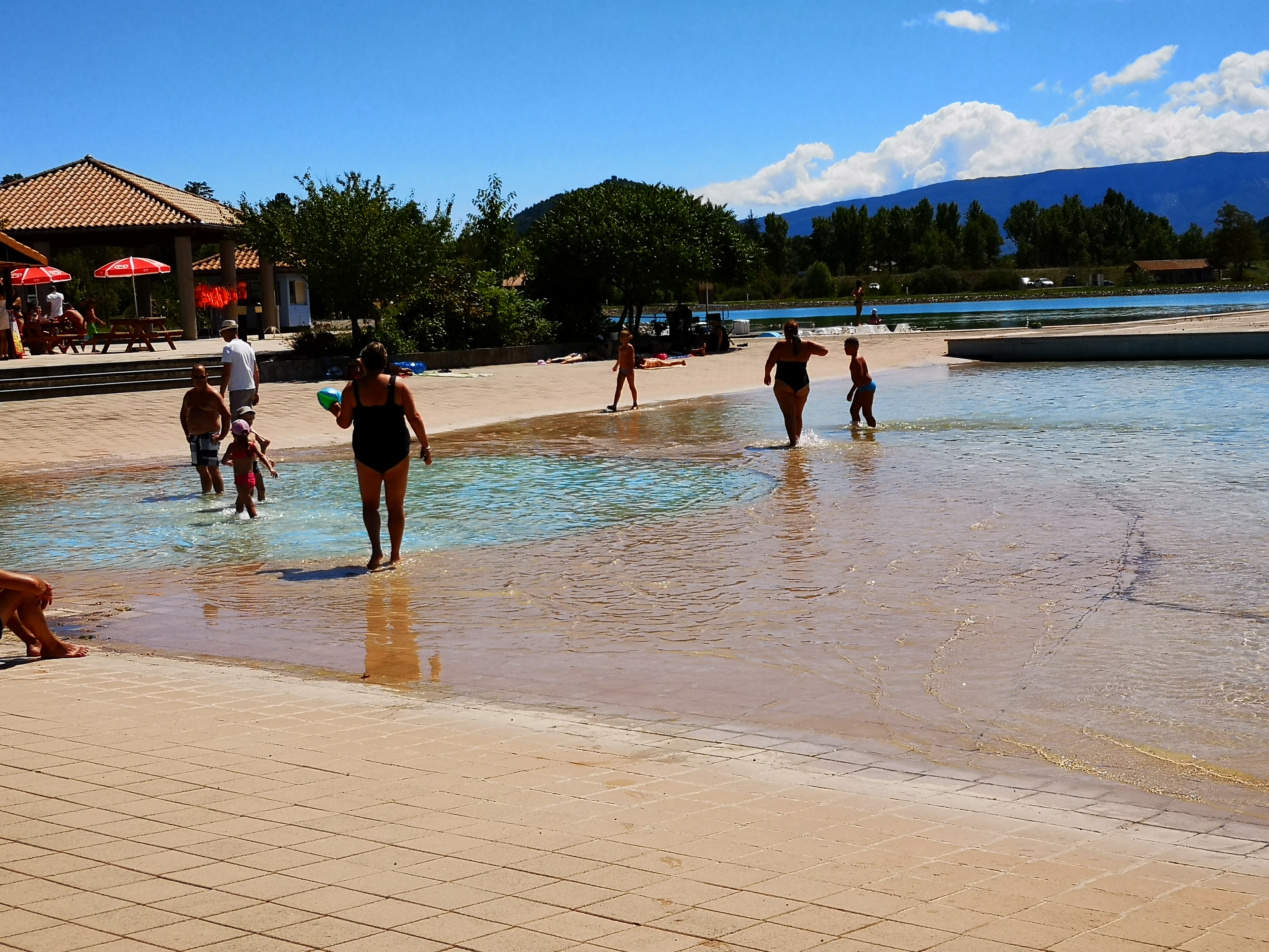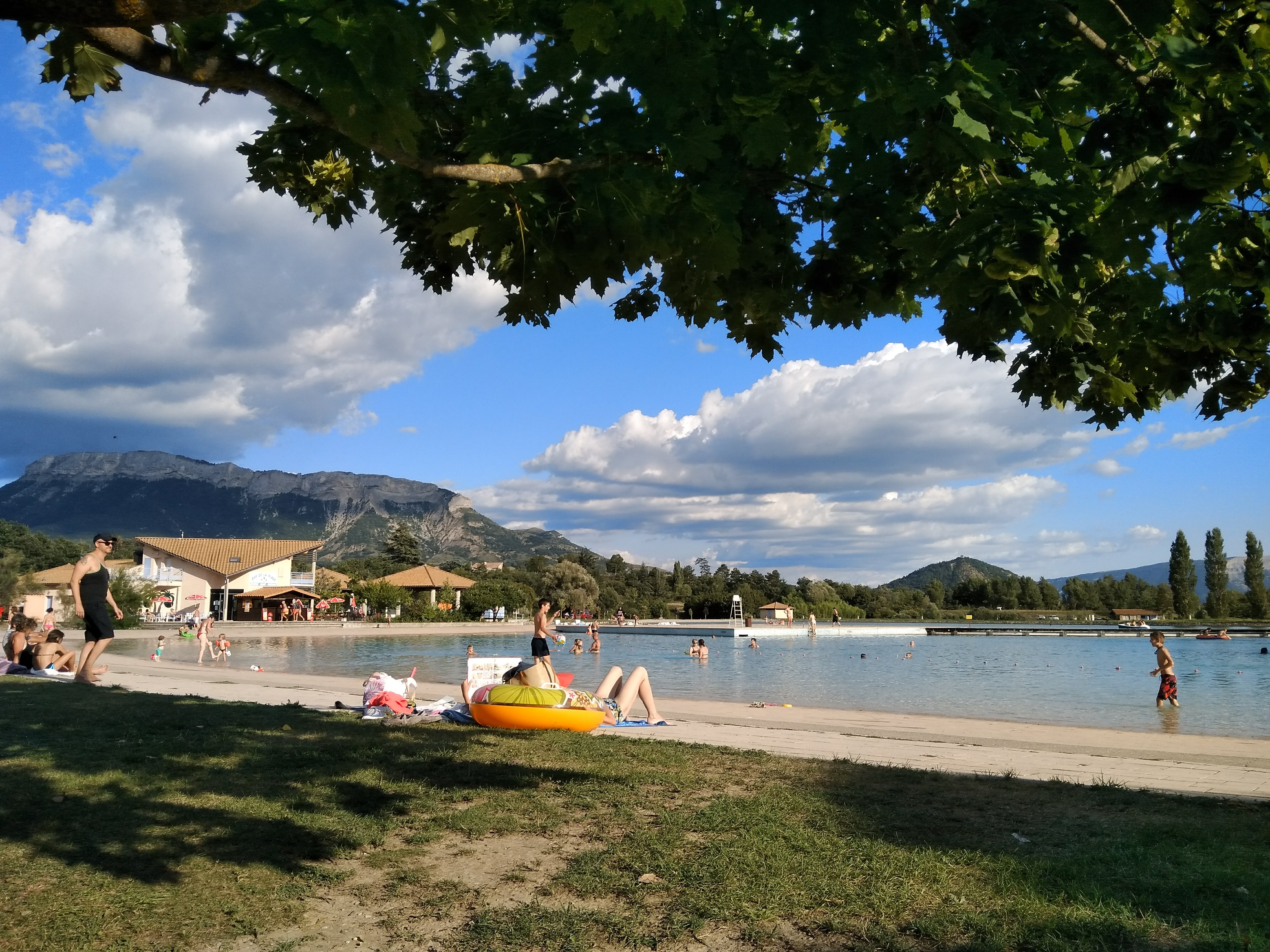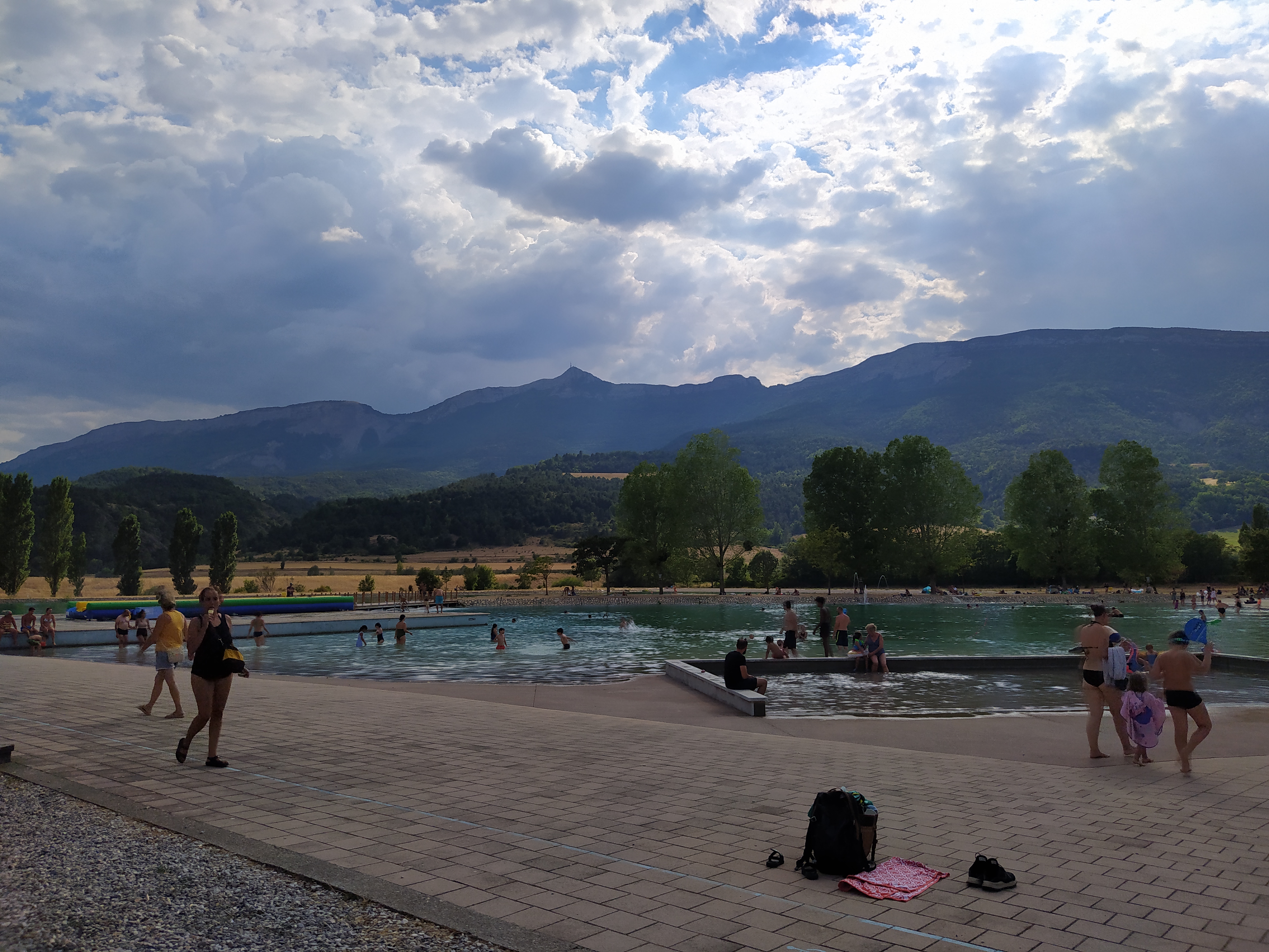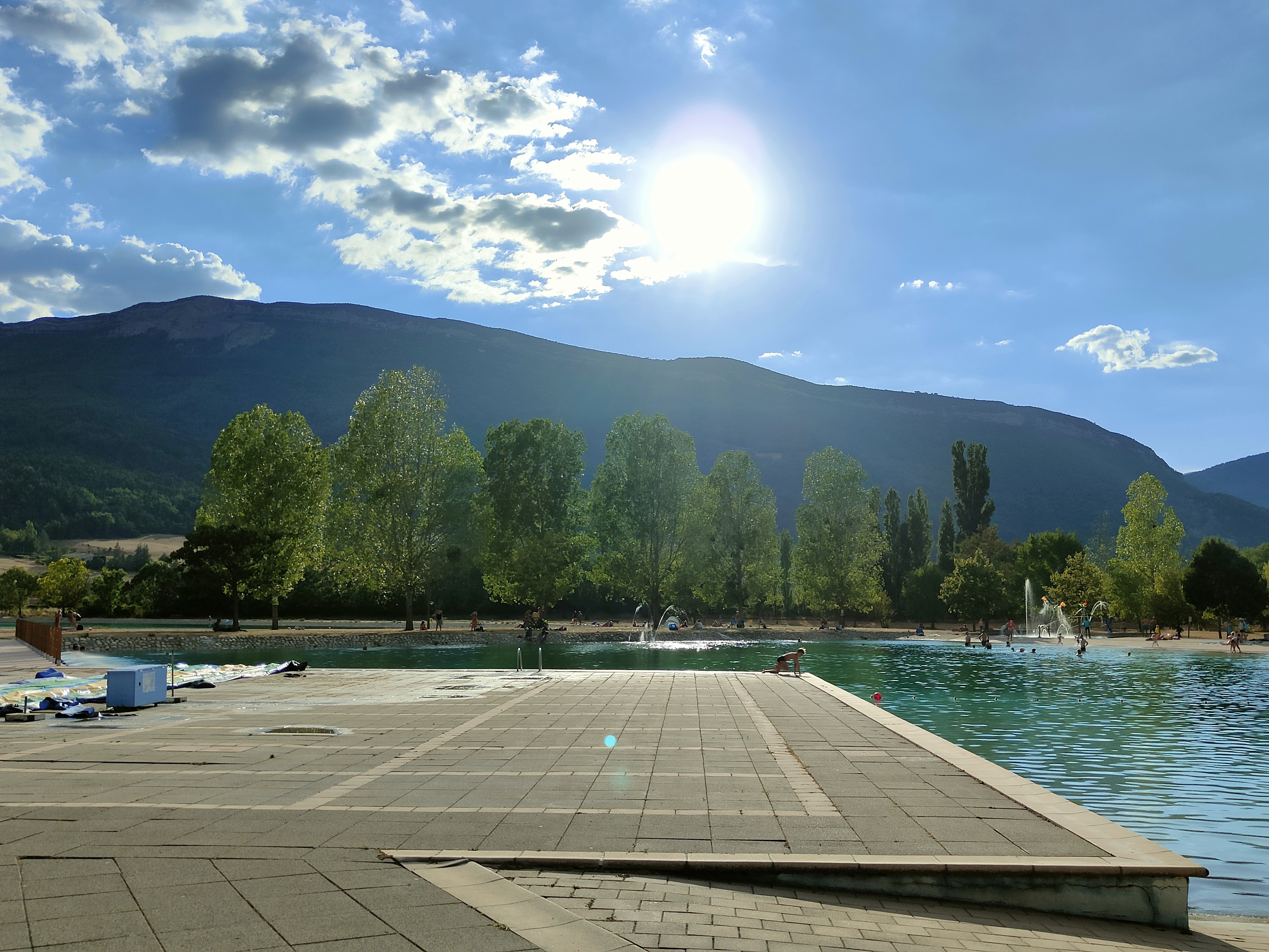 J'adore cet endroit. Comme au milieu de nulle part, protégé par les montagnes, on a cette impression d'être seul au monde tout en étant entourée de plein de gens. Une drôle de sensation mais ô combien plaisante. Plage de gazon, d'asphalte ou de pierres, à l'ombre d'un arbre ou d'un parasol ; barbecue, pique-nique traditionnelle ou même restaurant-buvette ; eau chlorée ou naturelle ; vous n'aurez que l'embarras du choix. Repos, dépaysement et farniente sont au rendez-vous !