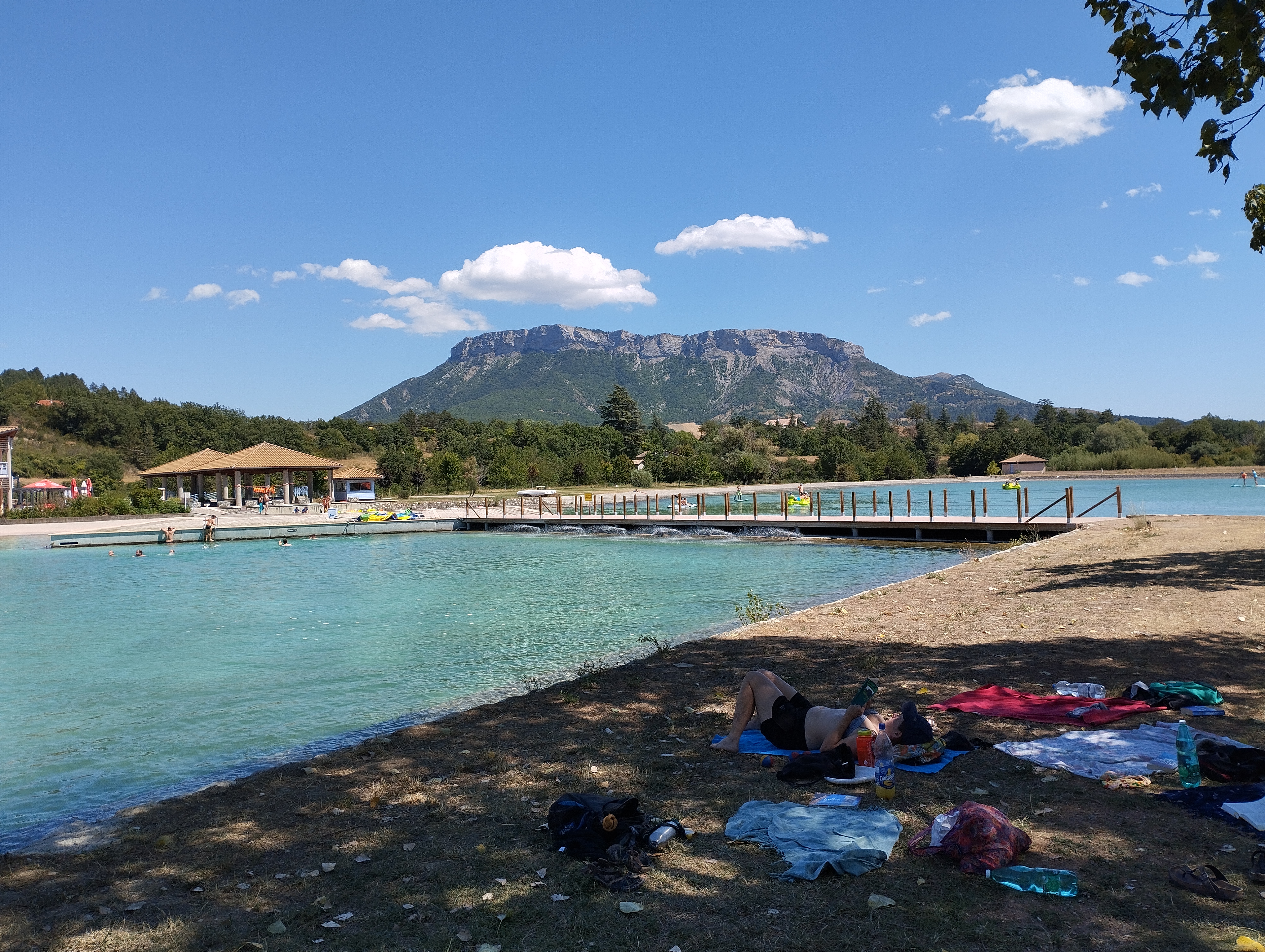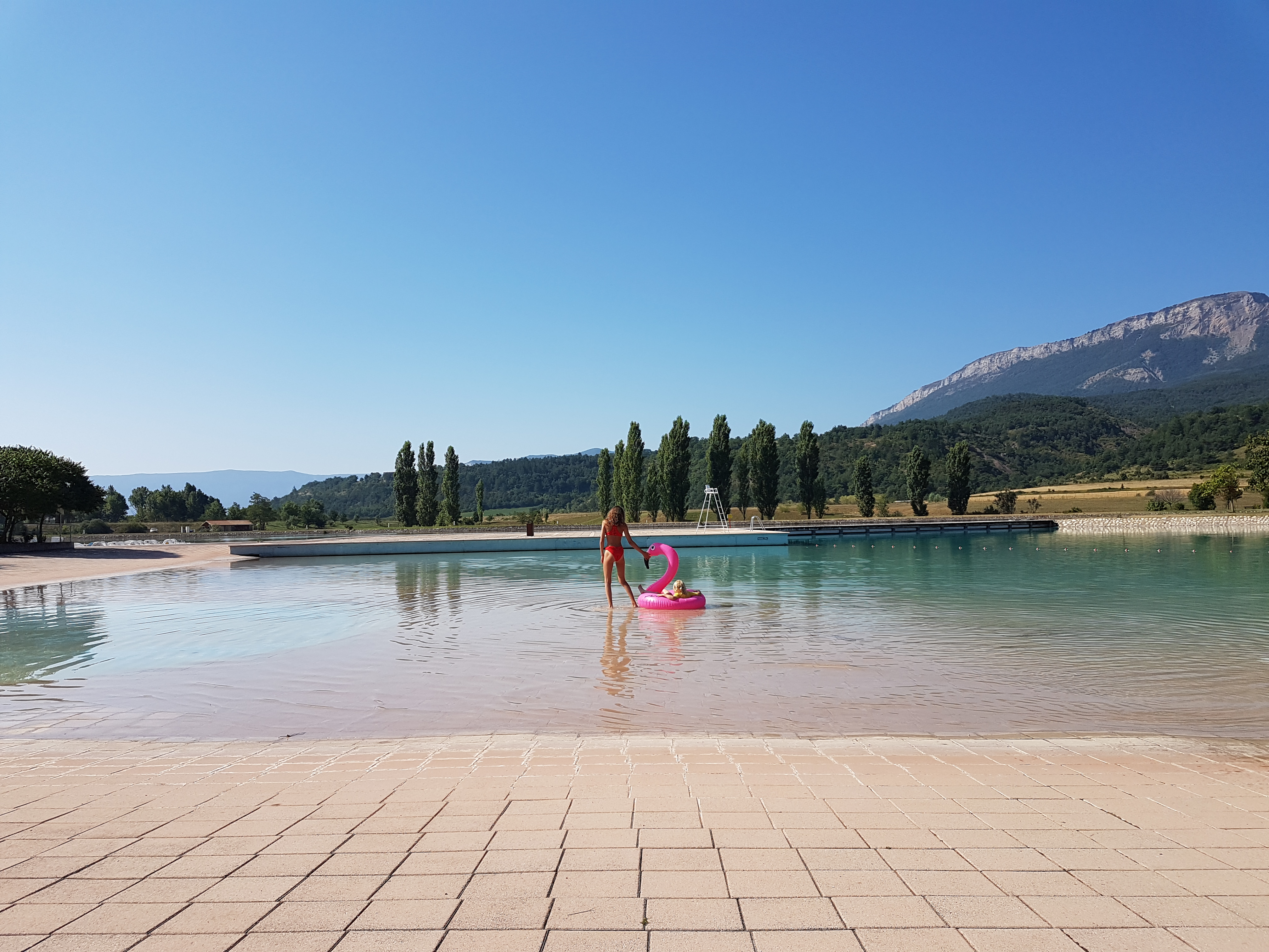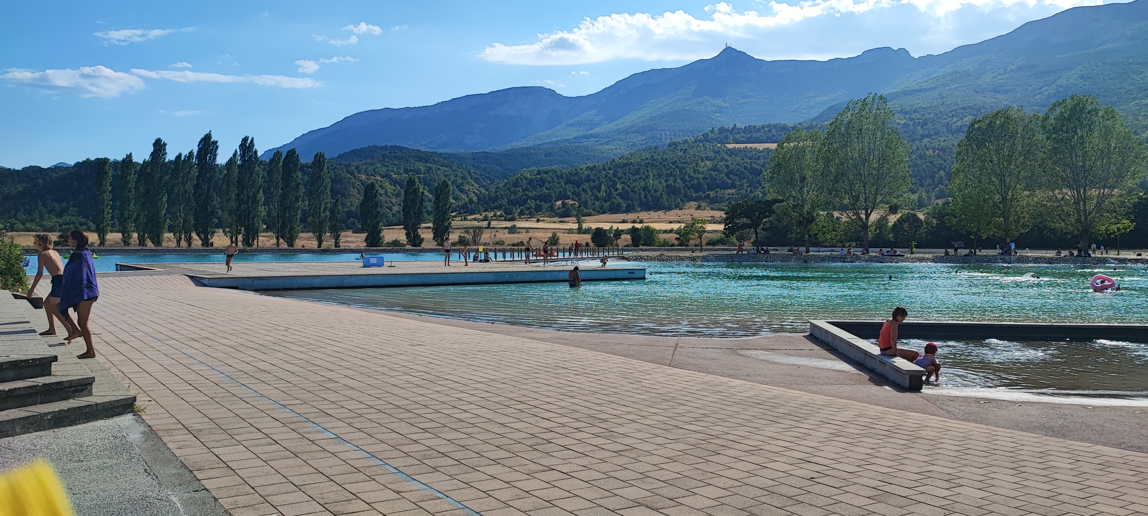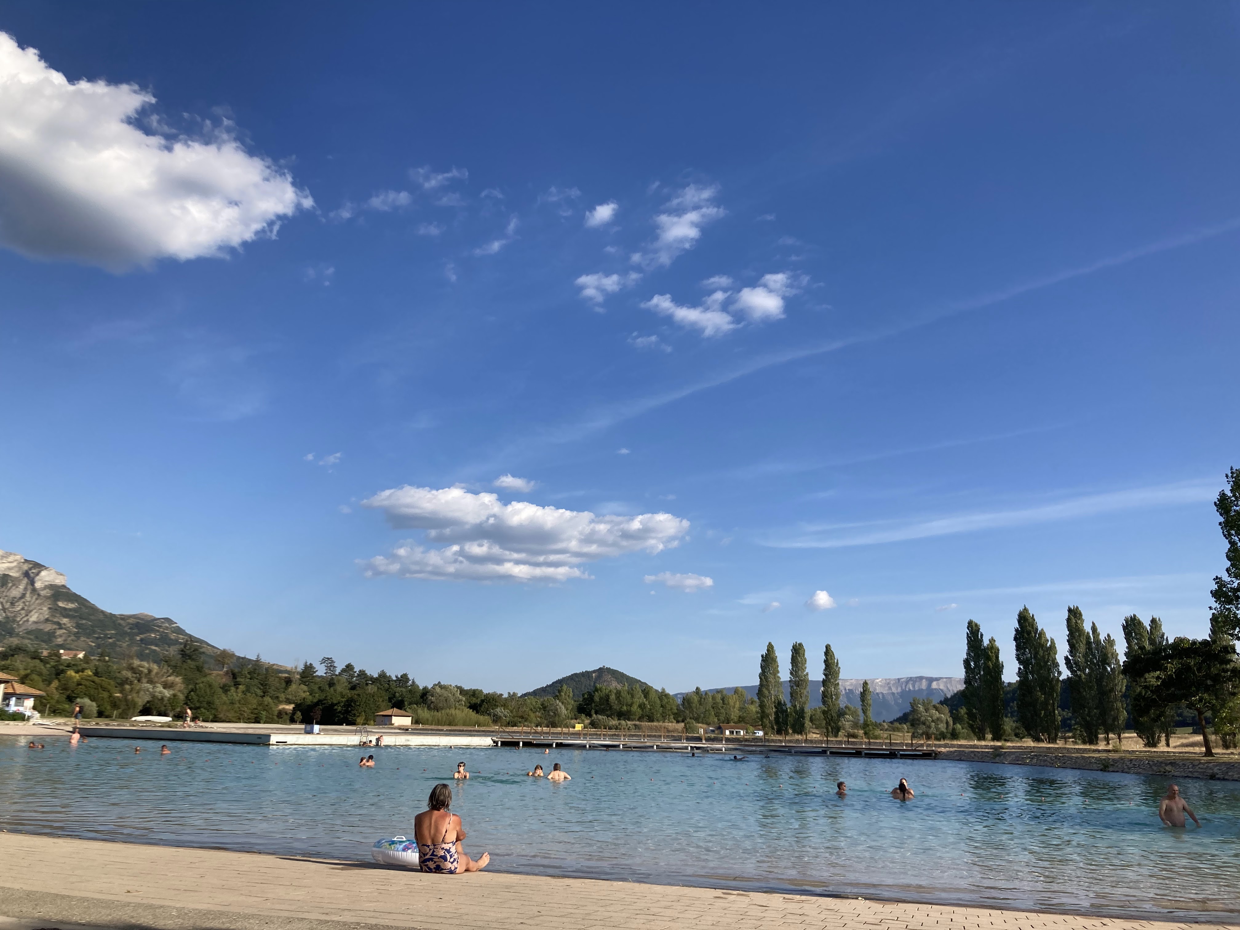 J'adore cet endroit. Comme au milieu de nulle part, protégé par les montagnes, on a cette impression d'être seul au monde tout en étant entourée de plein de gens. Une drôle de sensation mais ô combien plaisante. Plage de gazon, d'asphalte ou de pierres, à l'ombre d'un arbre ou d'un parasol ; barbecue, pique-nique traditionnelle ou même restaurant-buvette ; eau chlorée ou naturelle ; vous n'aurez que l'embarras du choix. Repos, dépaysement et farniente sont au rendez-vous !