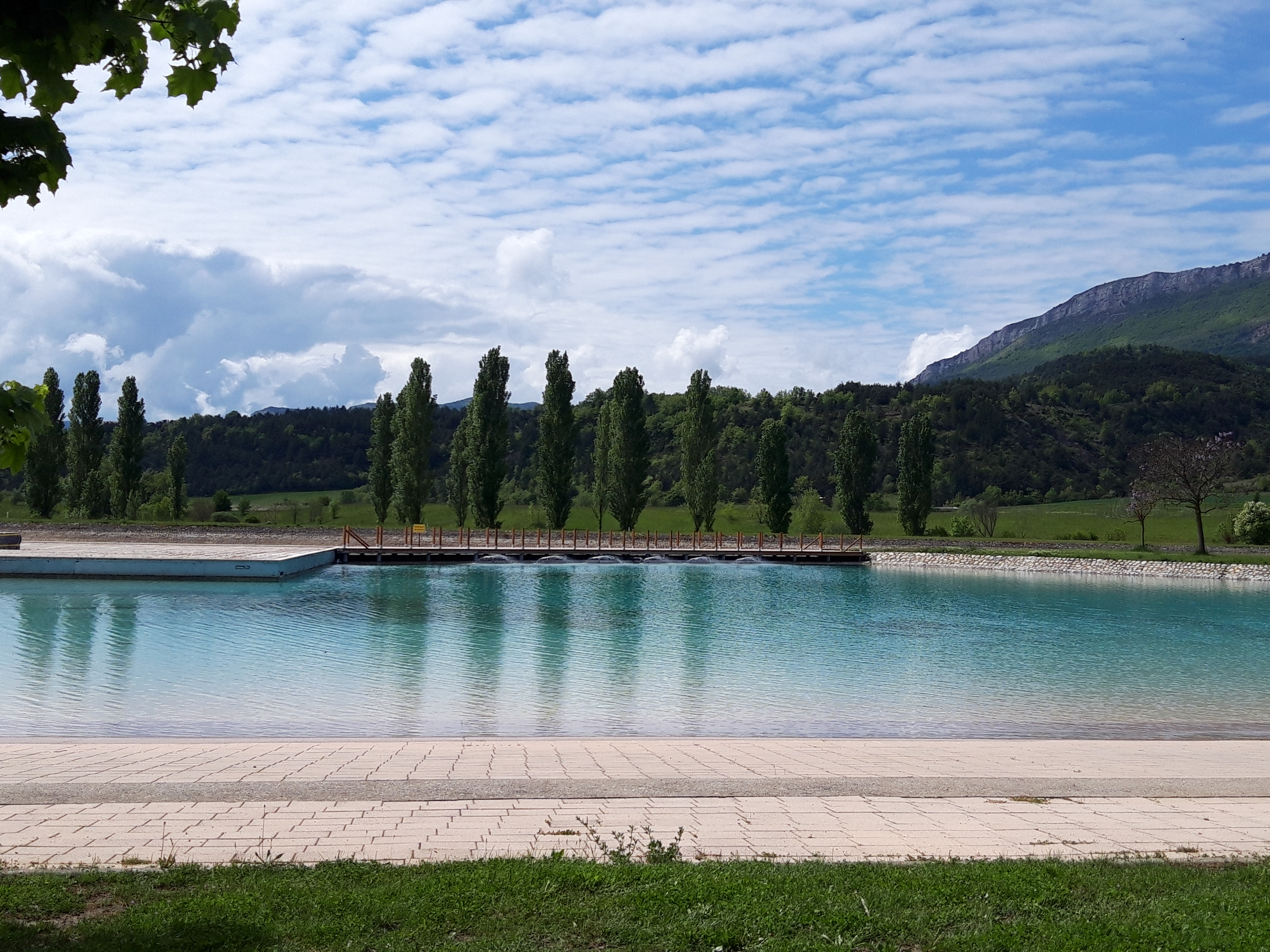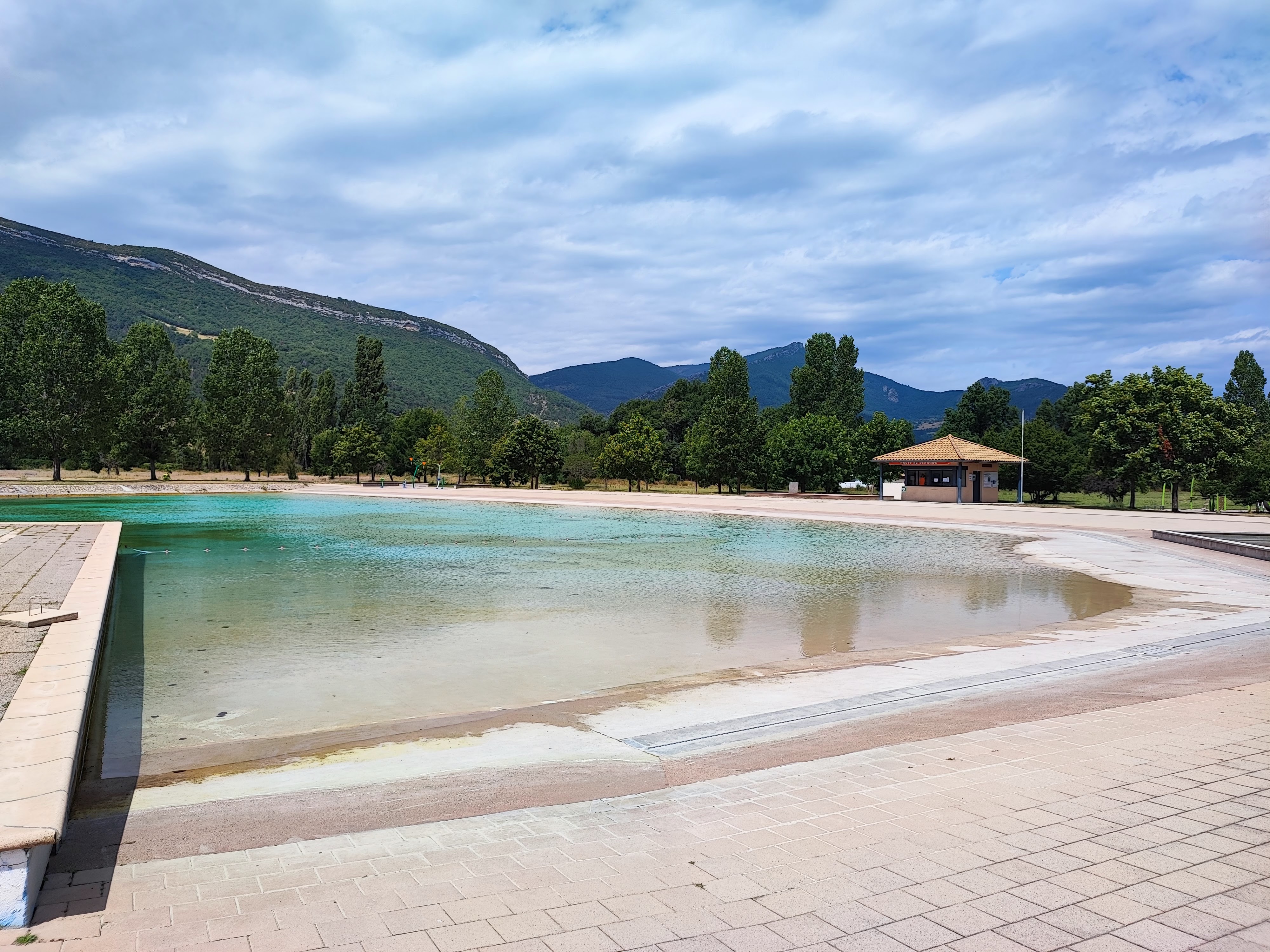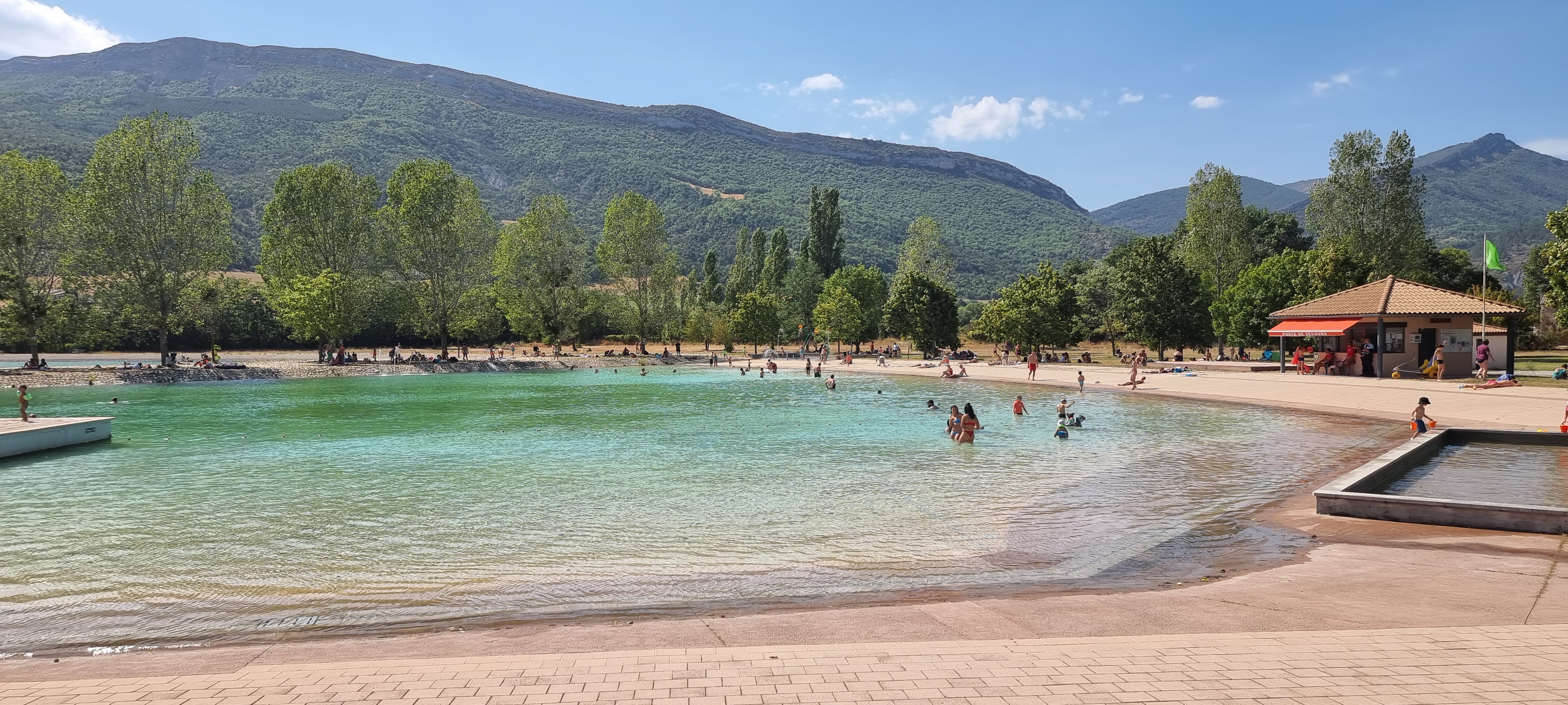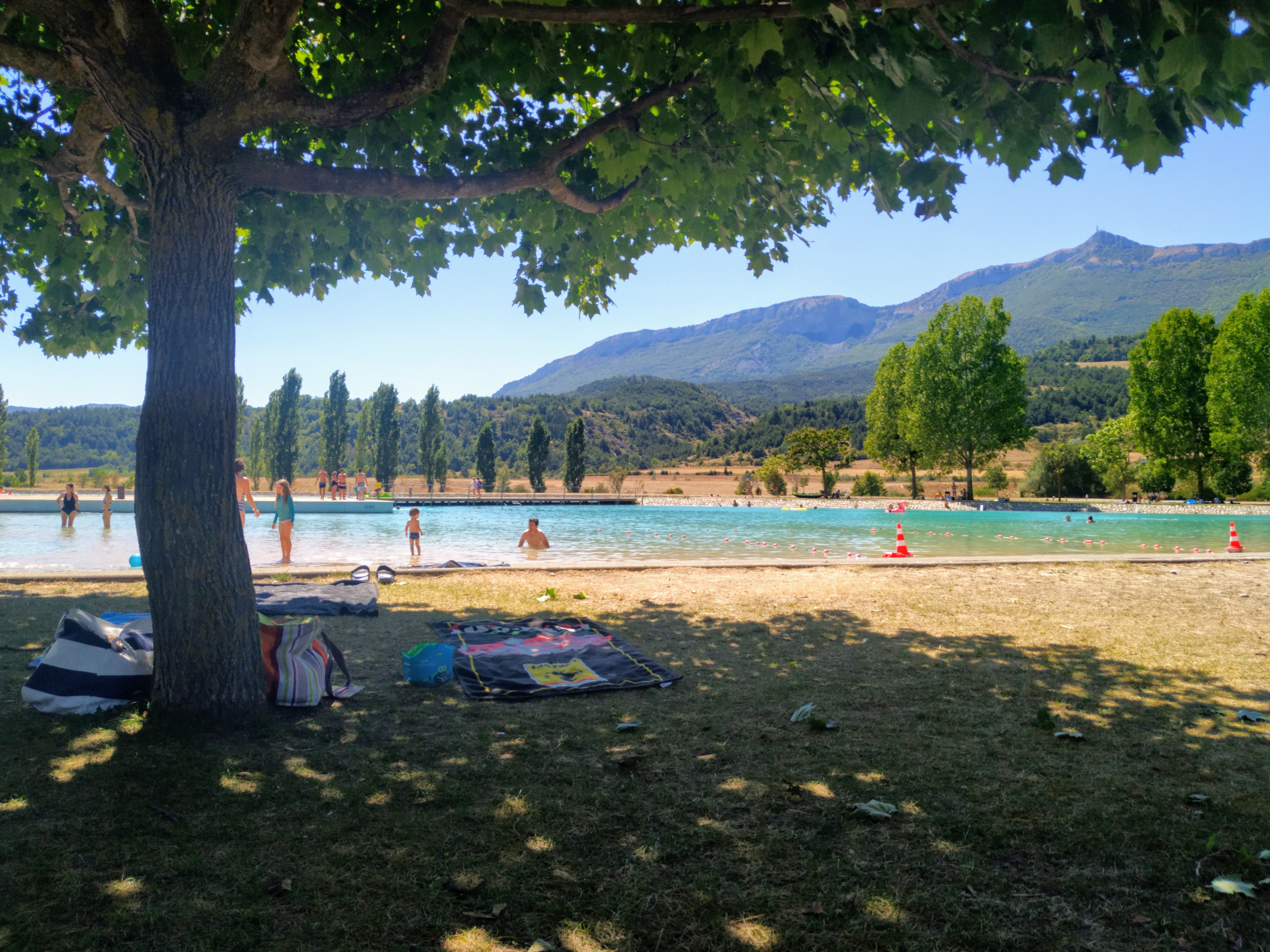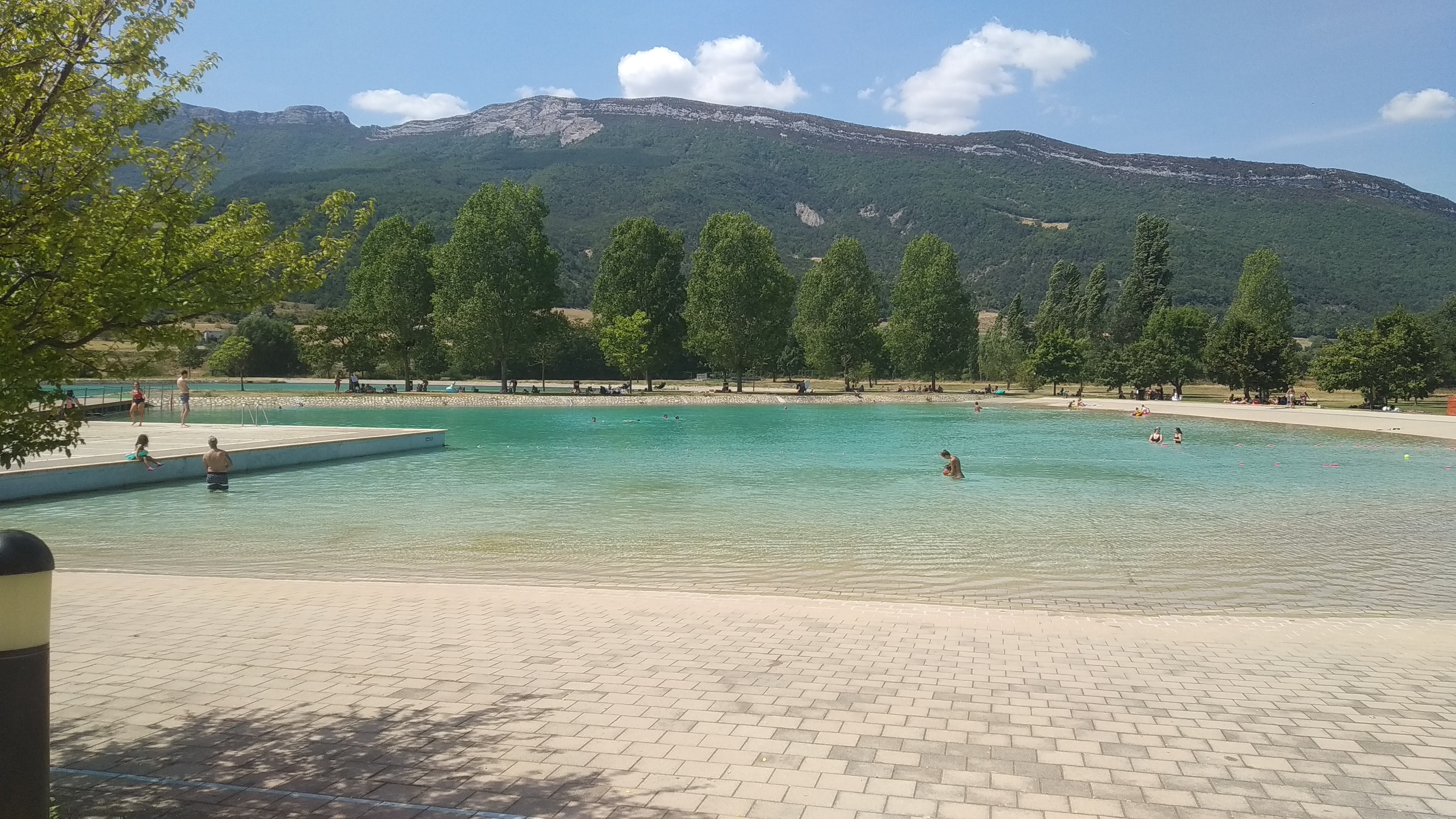 J'adore cet endroit. Comme au milieu de nulle part, protégé par les montagnes, on a cette impression d'être seul au monde tout en étant entourée de plein de gens. Une drôle de sensation mais ô combien plaisante. Plage de gazon, d'asphalte ou de pierres, à l'ombre d'un arbre ou d'un parasol ; barbecue, pique-nique traditionnelle ou même restaurant-buvette ; eau chlorée ou naturelle ; vous n'aurez que l'embarras du choix. Repos, dépaysement et farniente sont au rendez-vous !