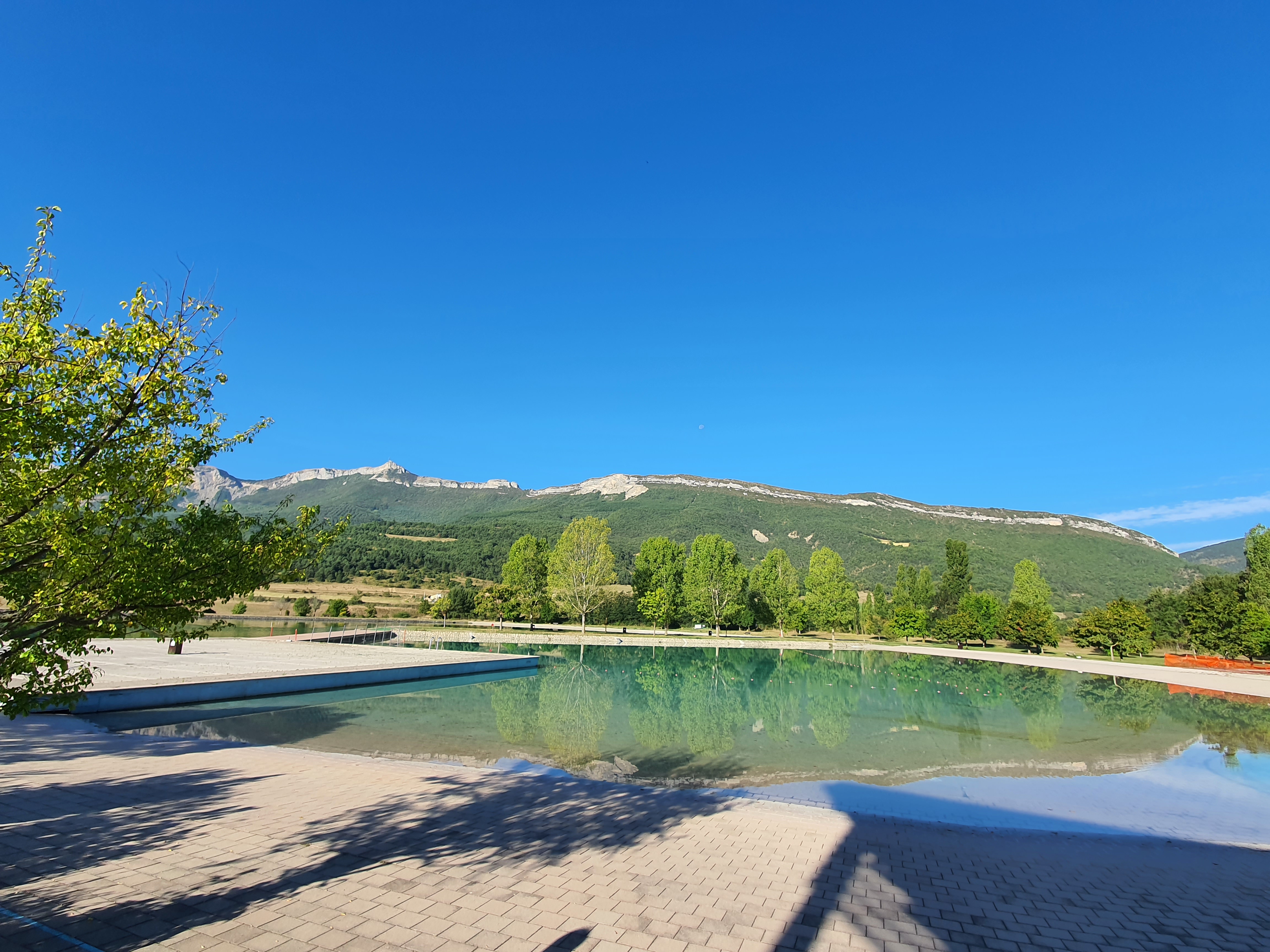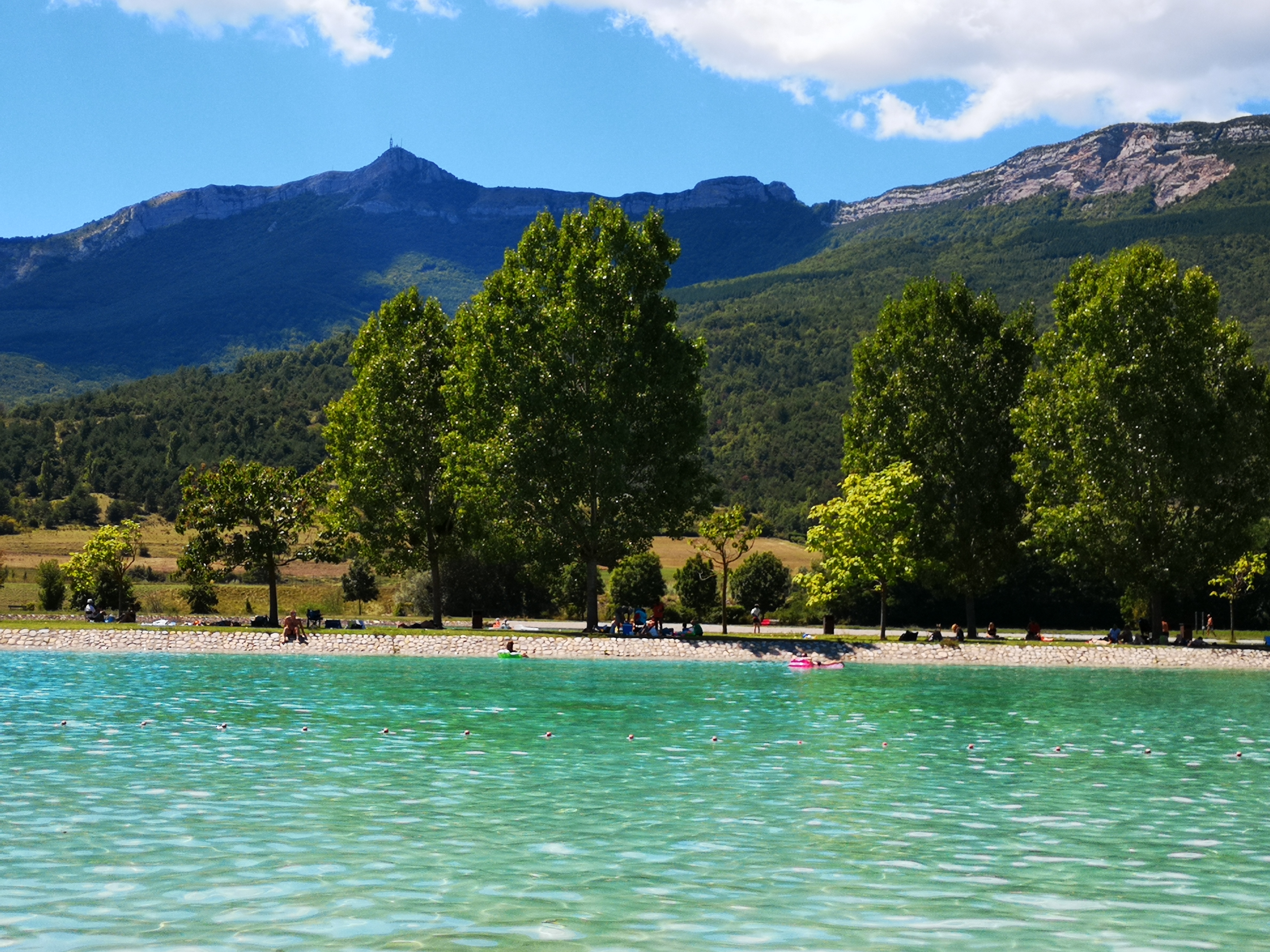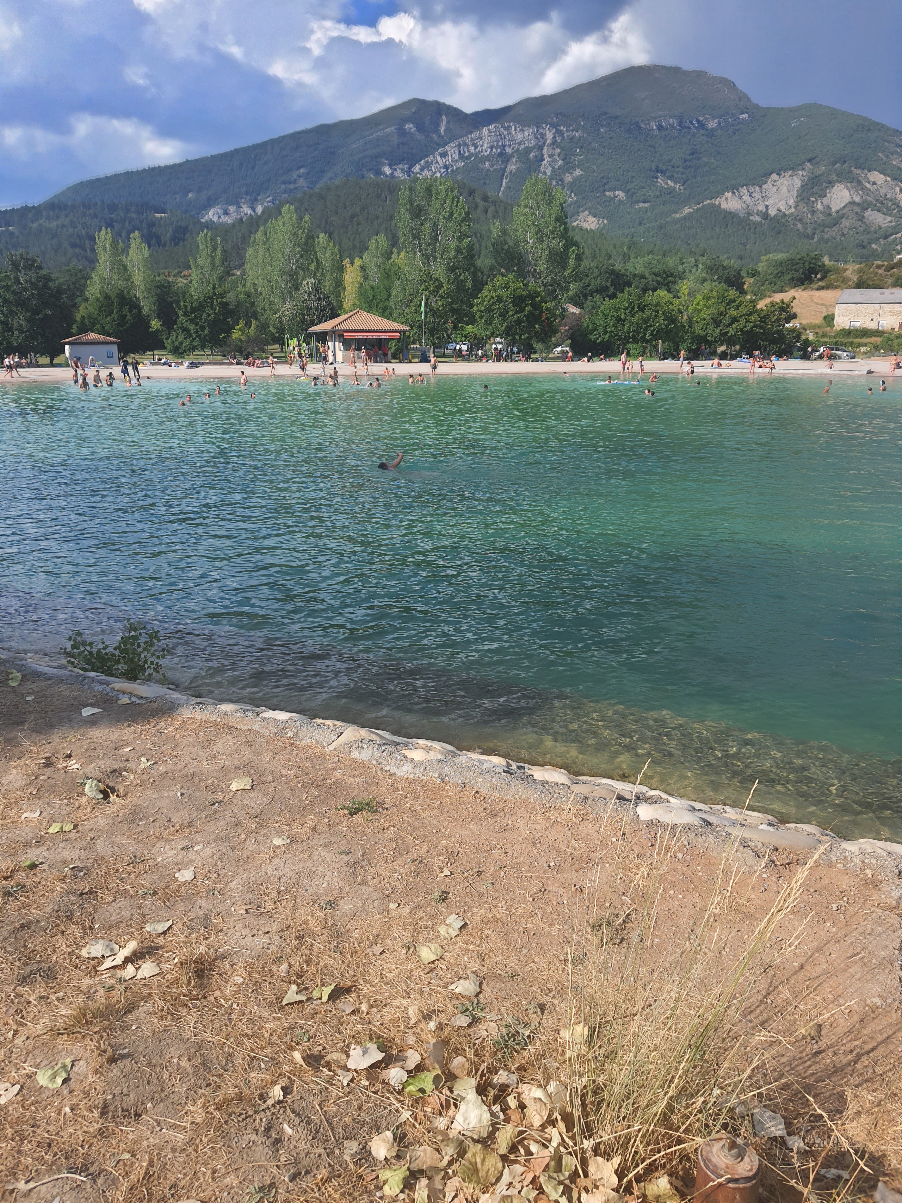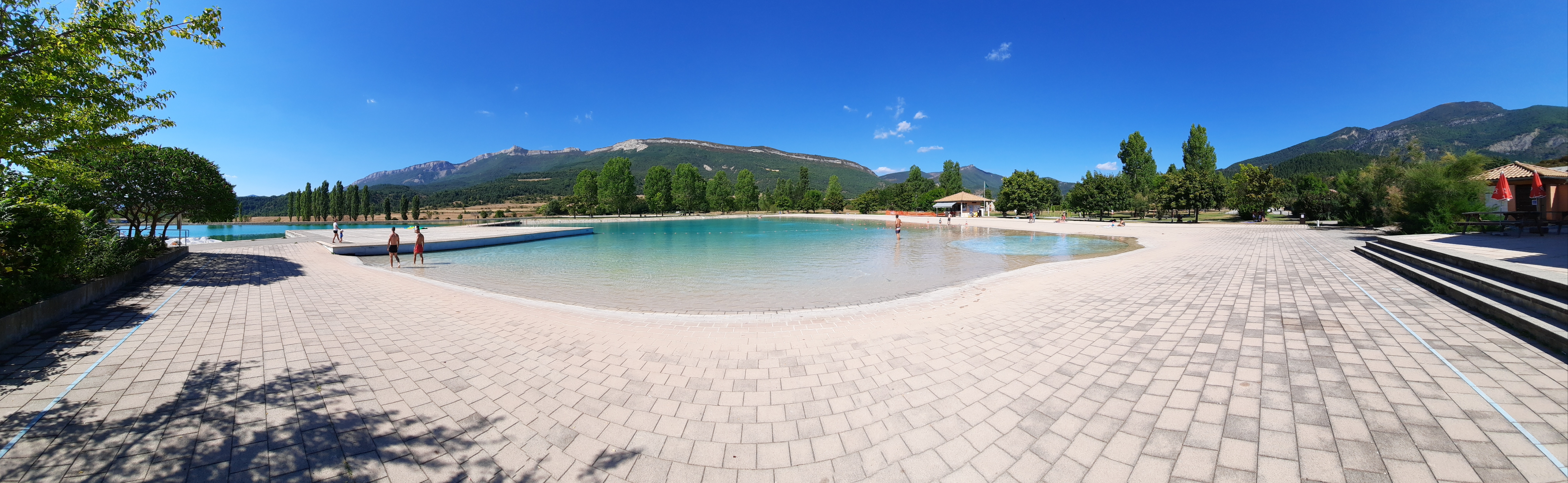 J'adore cet endroit. Comme au milieu de nulle part, protégé par les montagnes, on a cette impression d'être seul au monde tout en étant entourée de plein de gens. Une drôle de sensation mais ô combien plaisante. Plage de gazon, d'asphalte ou de pierres, à l'ombre d'un arbre ou d'un parasol ; barbecue, pique-nique traditionnelle ou même restaurant-buvette ; eau chlorée ou naturelle ; vous n'aurez que l'embarras du choix. Repos, dépaysement et farniente sont au rendez-vous !