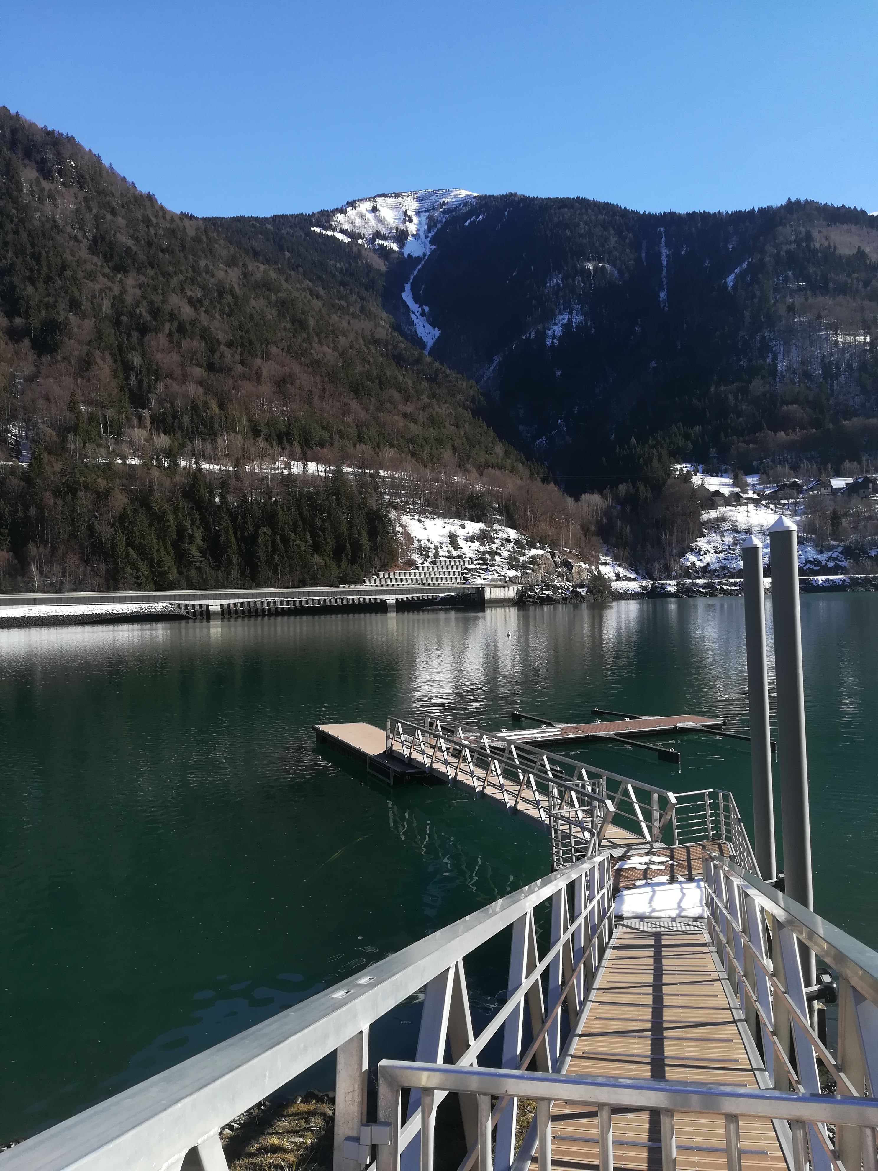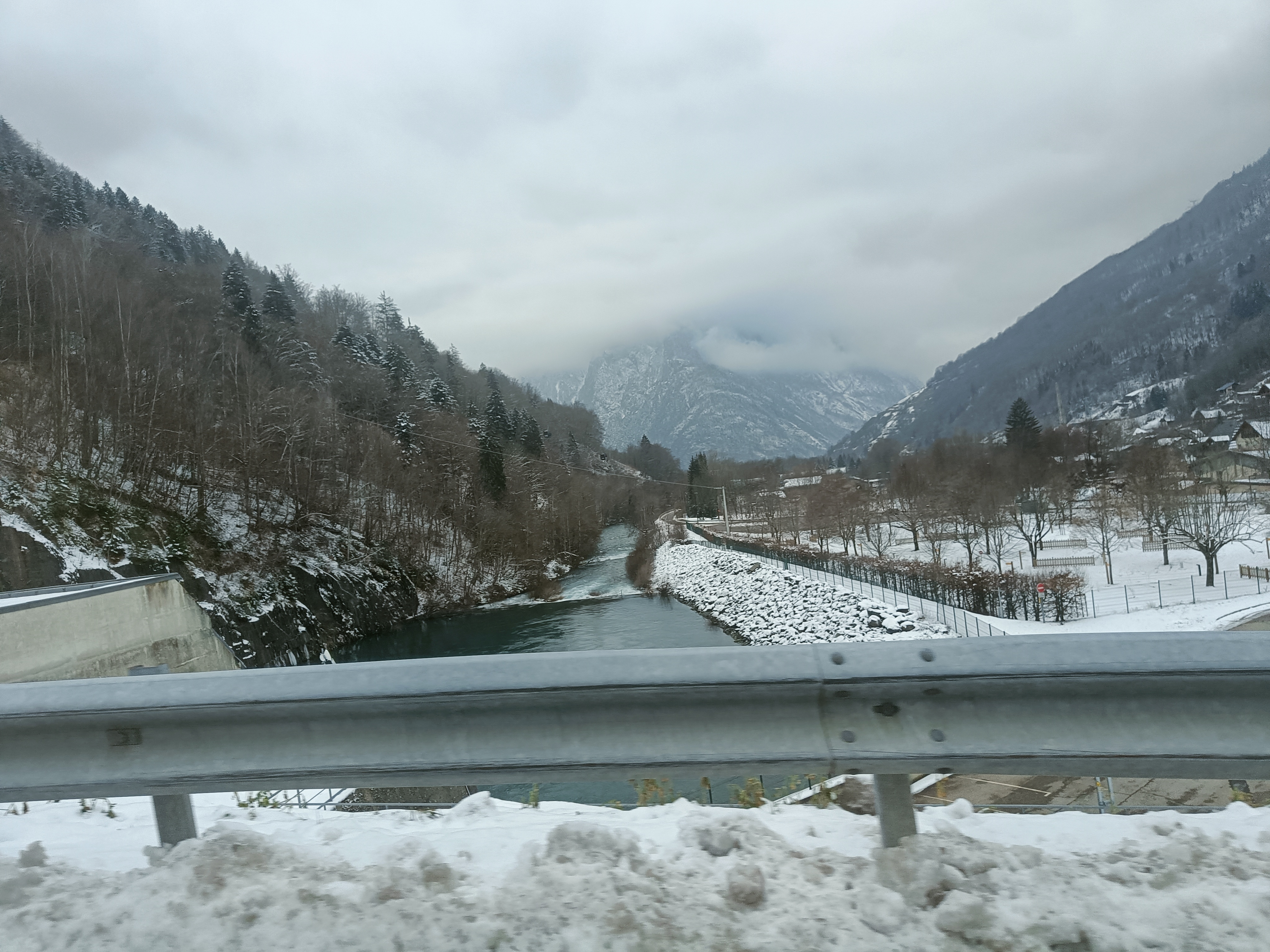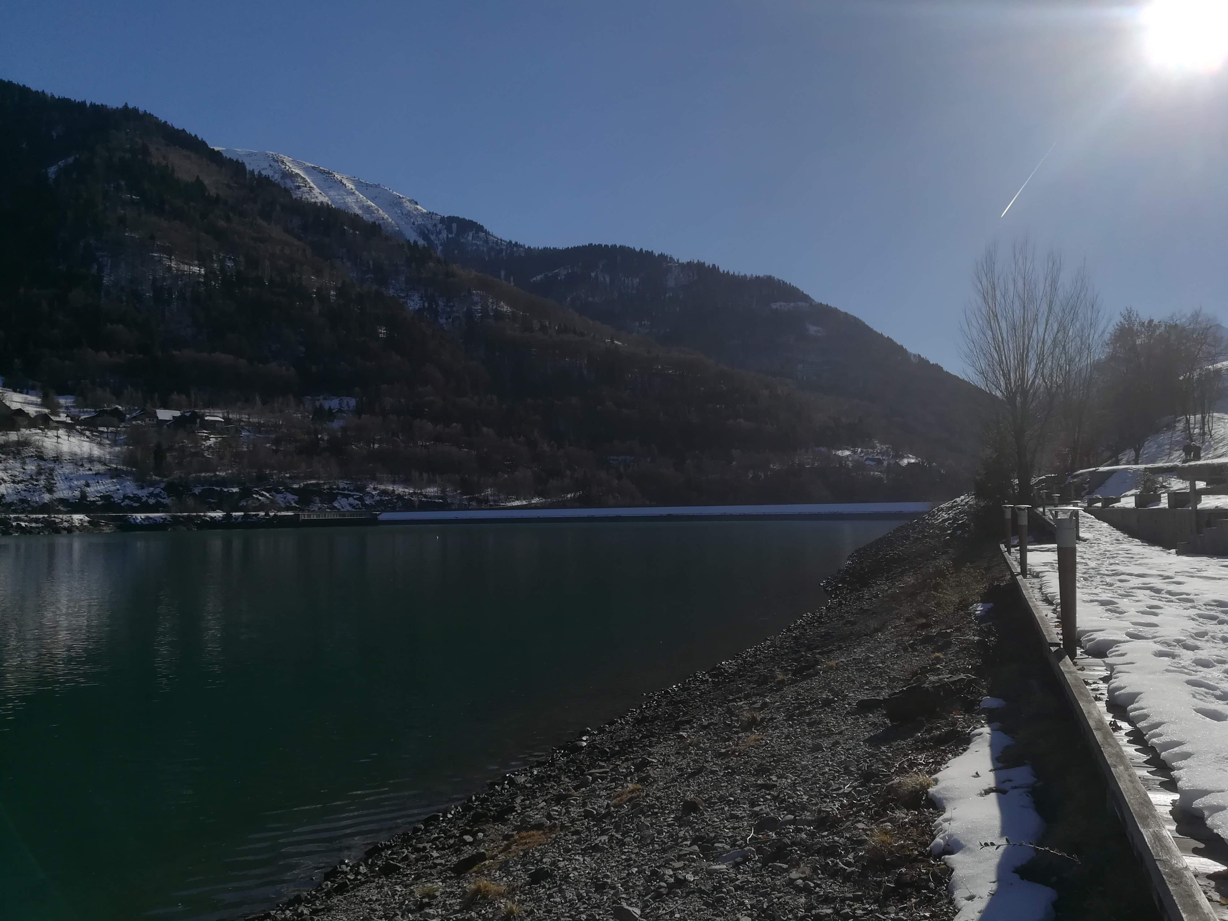Belle vue sur le lac dans la neige depuis le barrage. Donnerait 5 étoiles mais il perd une étoile car cet endroit a coûté une fois à Steven Kruiswijk le Tour de France et ça fait toujours mal.
