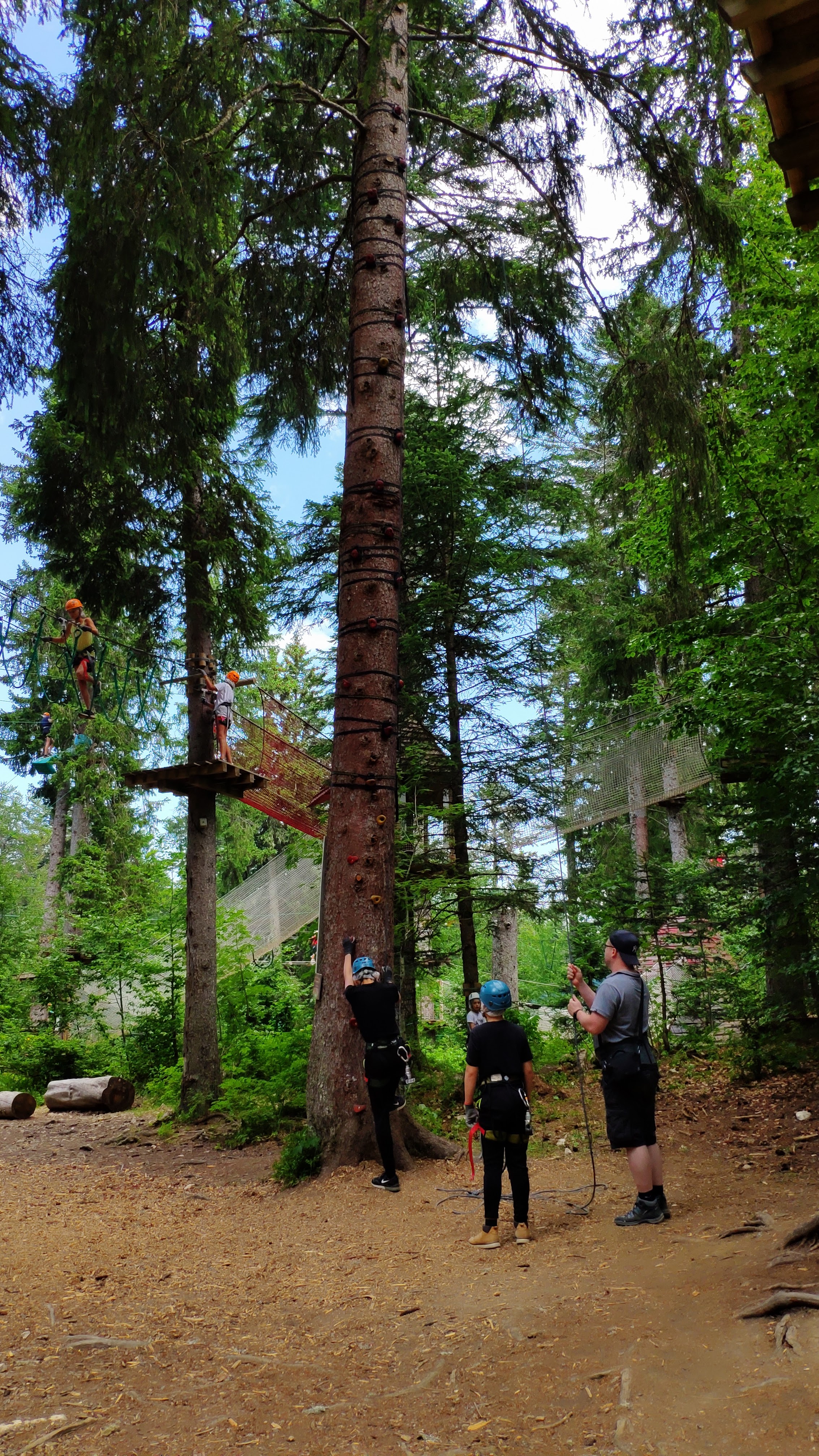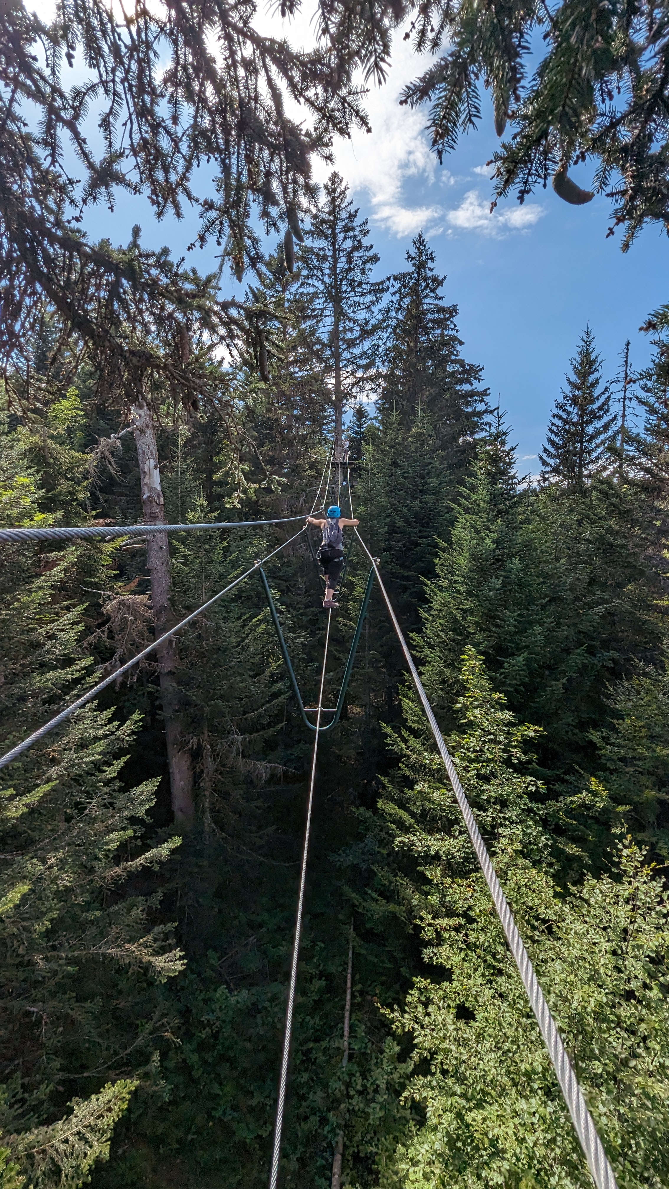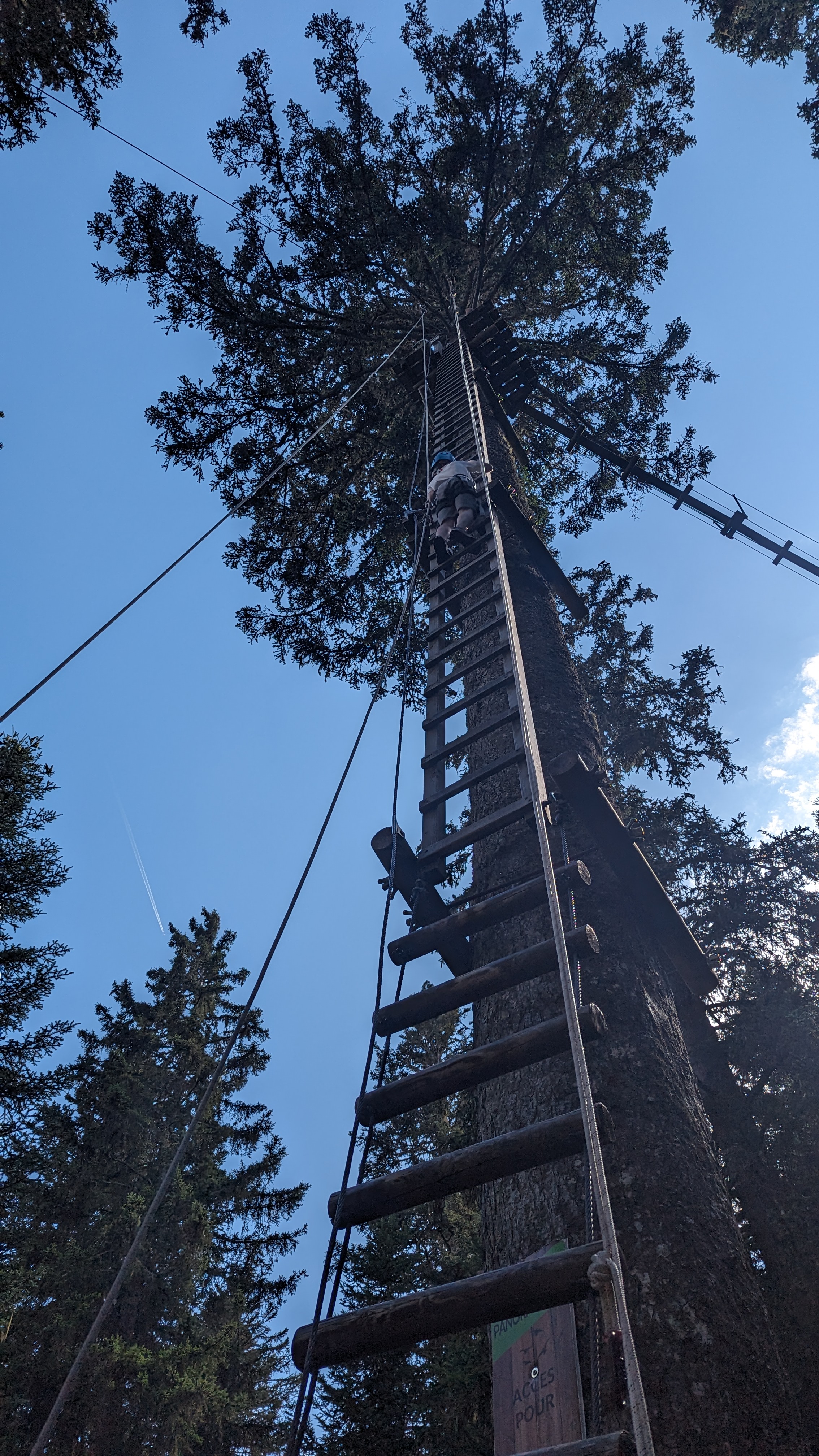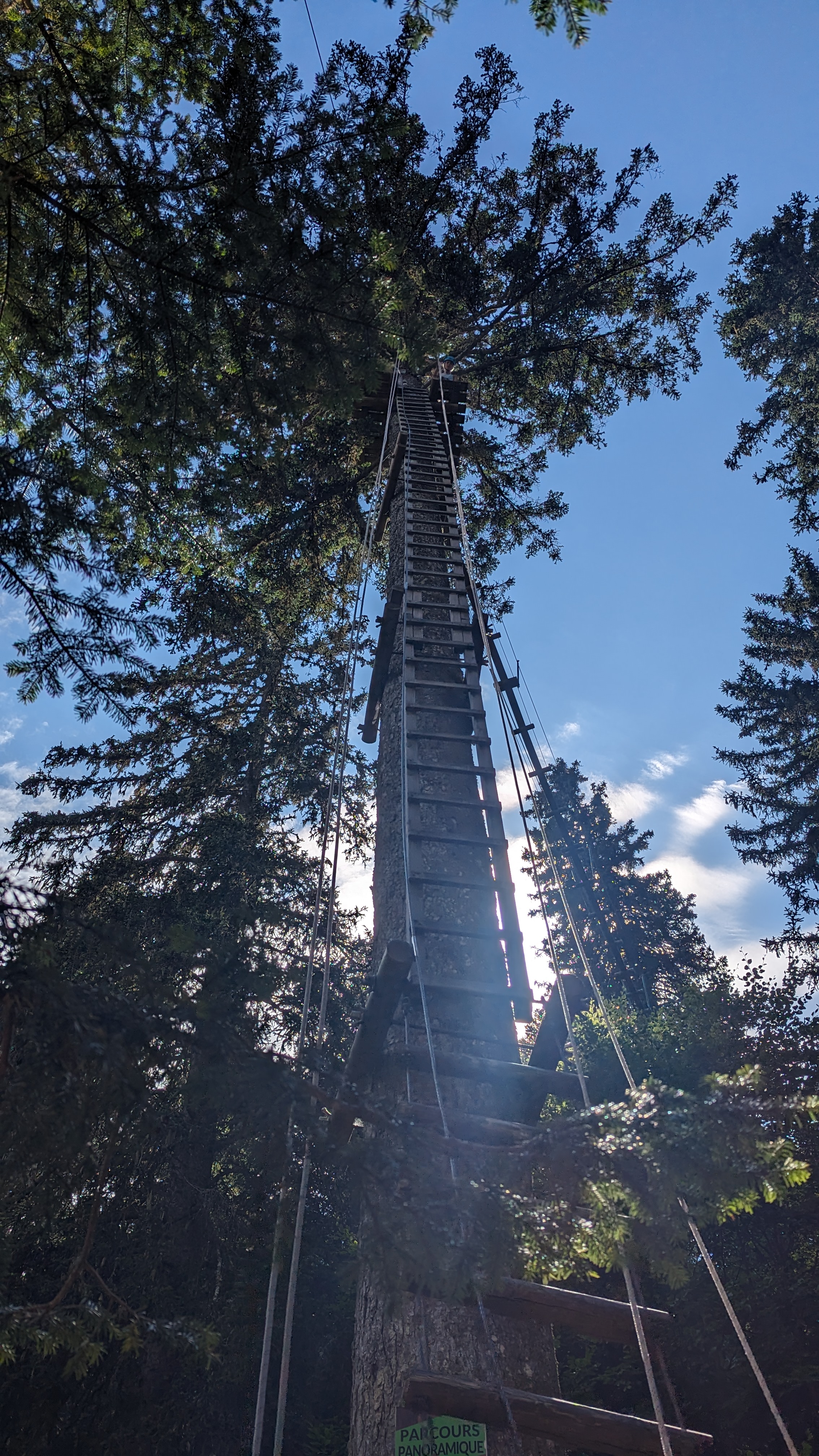 Beau décor en montagne et des parcours pour tout niveaux, monter à l'échelle à 40 metres de haut ça décoiffe