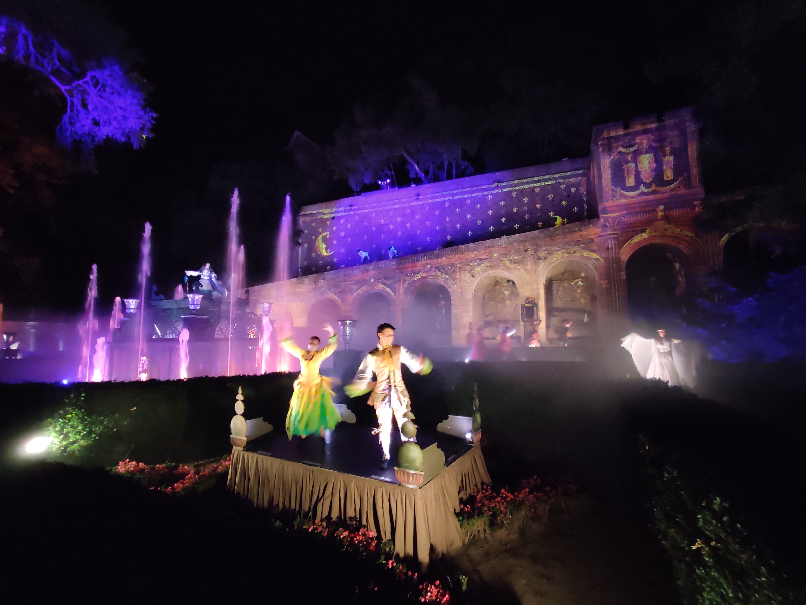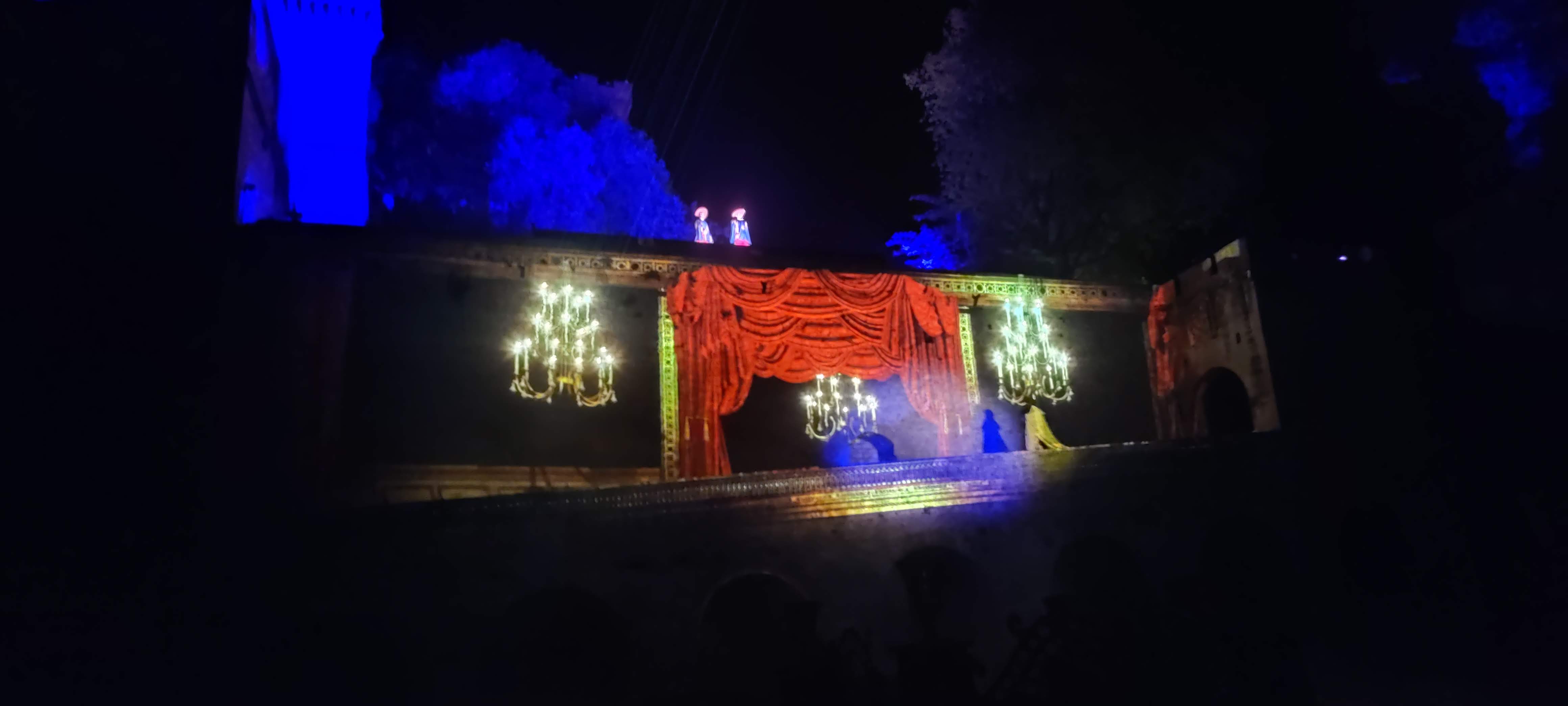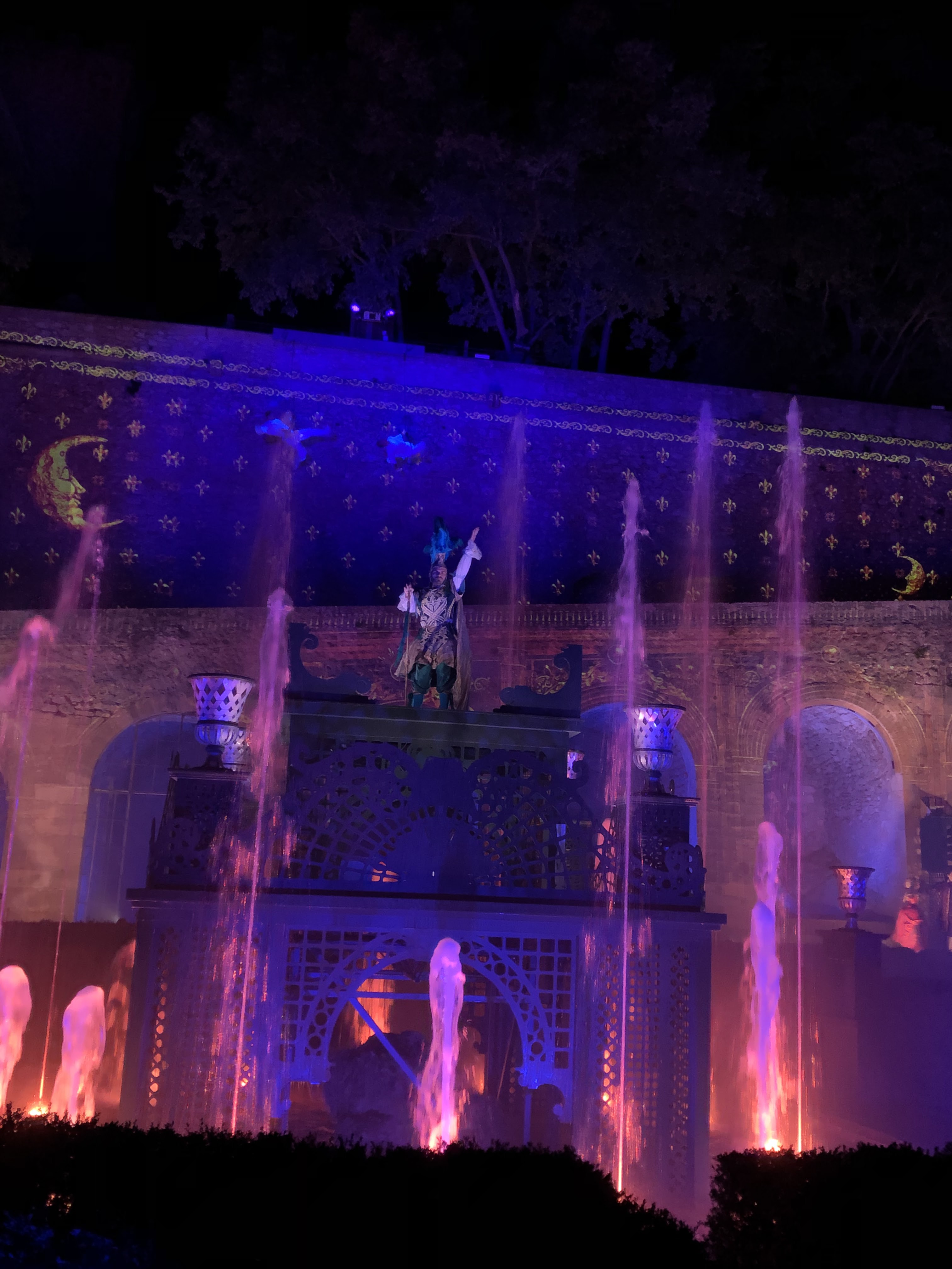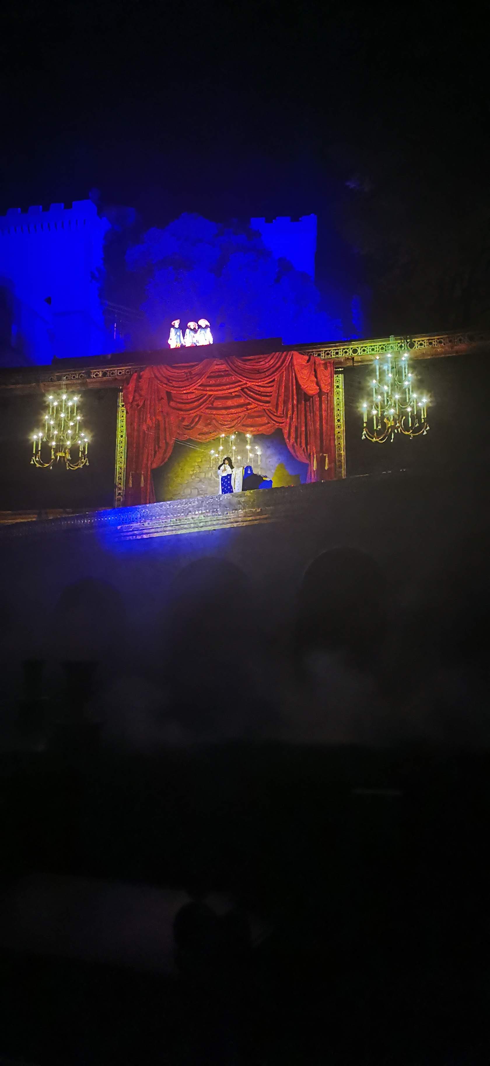 Spectacle magnifique en extérieur à la nuit tombée. la visite du château dans la journée est sublime, avec tout ces décors animés, ça bouge de partout et des personnages en costumes vous croises dans les couloirs. On se croirais dans les pirates des caraïbes à euro disney.