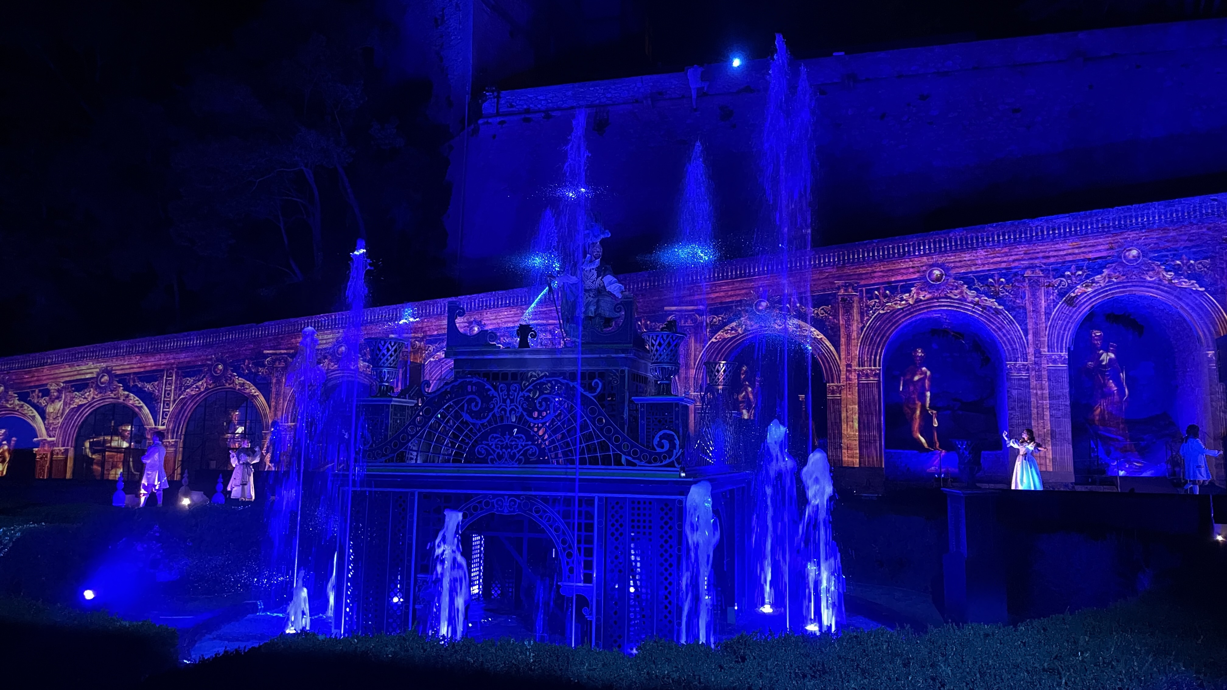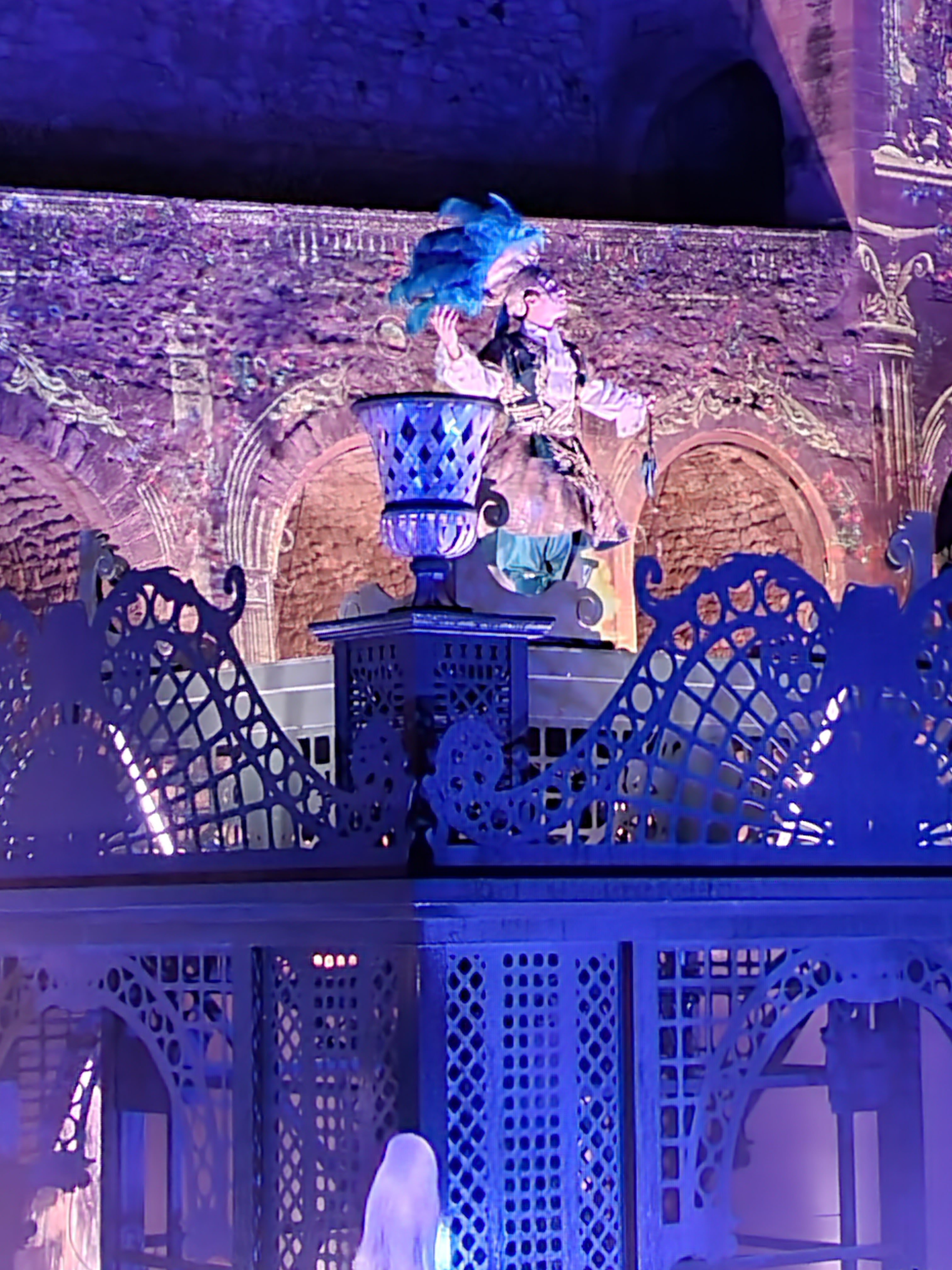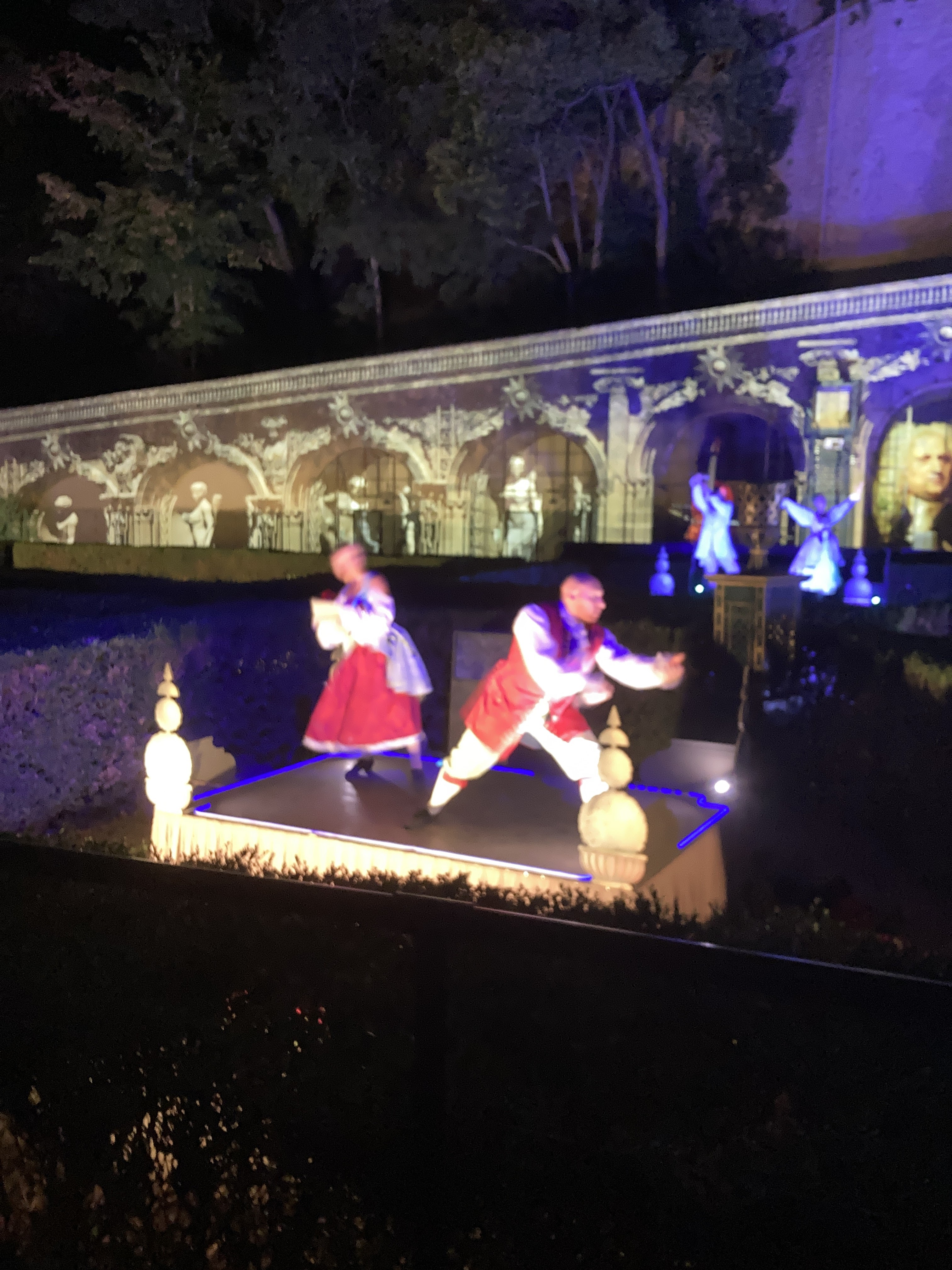 Spectacle magnifique en extérieur à la nuit tombée. la visite du château dans la journée est sublime, avec tout ces décors animés, ça bouge de partout et des personnages en costumes vous croises dans les couloirs. On se croirais dans les pirates des caraïbes à euro disney.