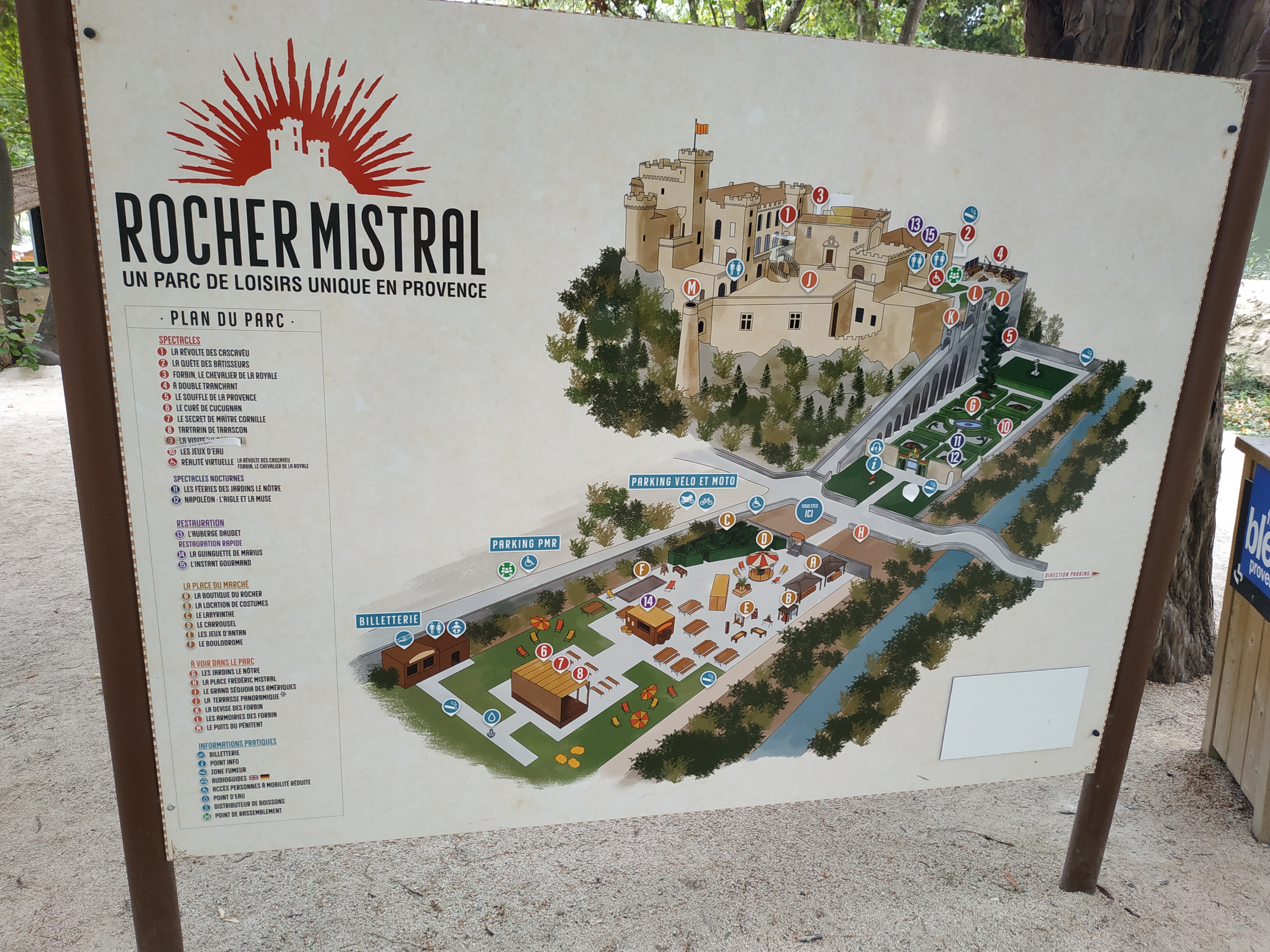 Très belle journée au rocher Mistral ! Nous y sommes allés de 11h à 22h30, ça nous a permis de voir tous les spectacles sans devoir courir dans tous les sens. Le staff est très accueillant et chaleureux. Leur présence illumine le parc. On a particulièrement adoré le spectacle à double tranchant, vraiment un grand bravo aux acteurs/cascadeurs ! Les tarifs de la Guinguette sont excessifs, c'est dommage (6€ le jambon beurre !). La féerie du soir était sympa mais pas aussi bien que ce qu'un billet supplémentaire laissait présager. (Attention, un voisin mécontent essai de gâcher le spectacle en mettant la musique à fond depuis sa fenêtre et nous a insulté alors que nous passions devant chez lui pour rentrer à notre voiture..... ) Ma fille de 9 ans s'est bien amusée avec le livret d'enquête, bien adapté à son âge et même aux plus jeunes ! Je recommande :)