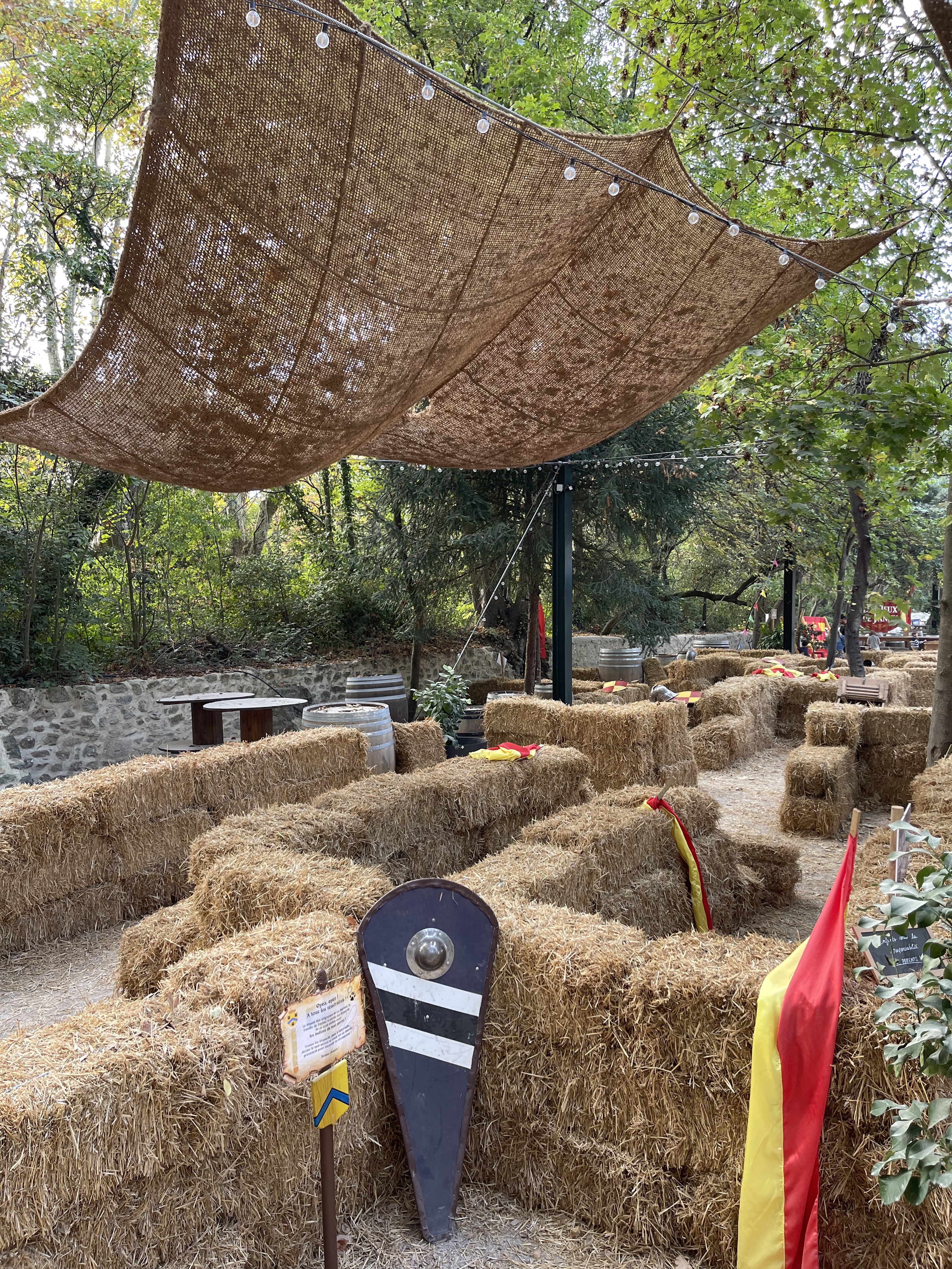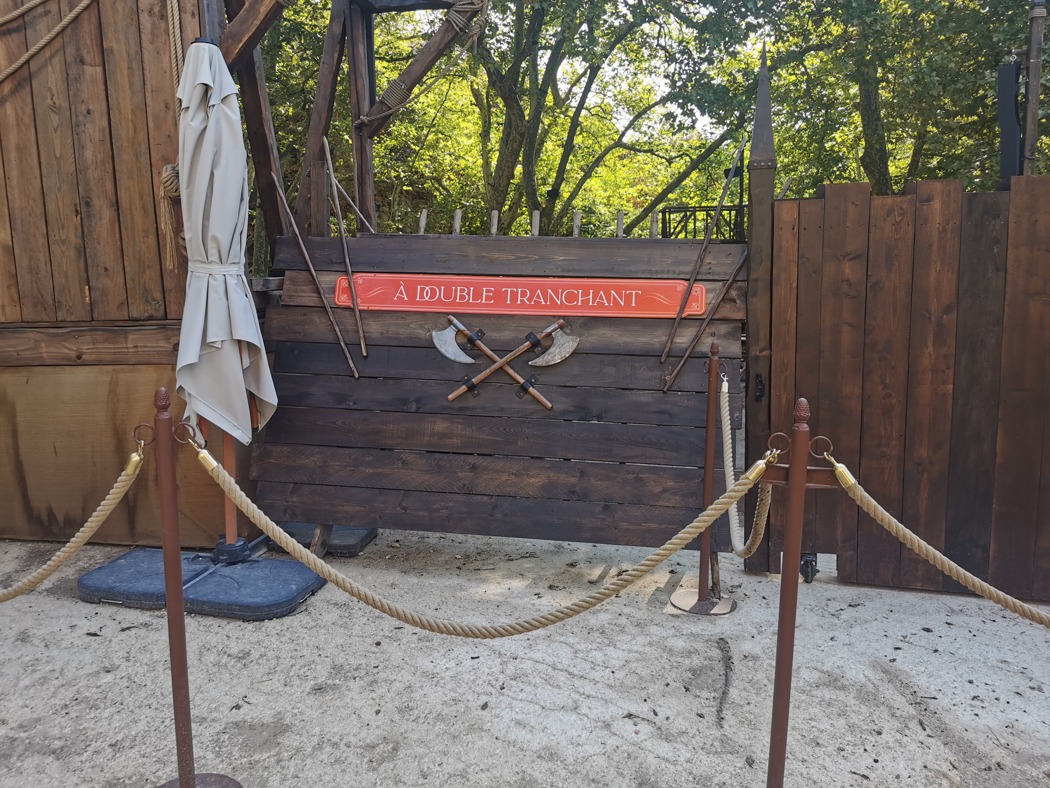 Le côté médiéval commence hélas avant l'entrée réelle dans le parc, ayant acheté à l'avance mes billets (comme tout le mode ce jour là et sûrement les autres jours aussi) on se retrouvent à poireauter 30 minutes pour entrer car il faut récupérer un bracelet polluant (papier colle) alors qu'un simple scan de QR code aurait été plus efficace et n'aurait pas générée cette attente désagréable, sans animation... A droite de la file sur la photo, pouvait passer directement les personnes sans billet... Le plan est certes joli mais très mal fichu avec des numéros qui pointent juste derrière le château 🏰 représenté en perspective alors qu'une vue de dessus aurait permis de se repérer... Heureusement les personnes du parc sont adorables et font vraiment de leur mieux pour compenser les petits manquements organisationnels. Une réflexion sur le parcours client s'impose de manière globale du billet, aux déambulations ou aux animations (des bandes sons en boucles adaptées à l'affluence avec des répétitions qui lassent (boucle sonore de 20 secondes entendues 6 fois car on ne pouvait pas avancer plus vite) mais le parc a en soit un beau potentiel ! J'espère que la direction sera prendre le virage à temps !