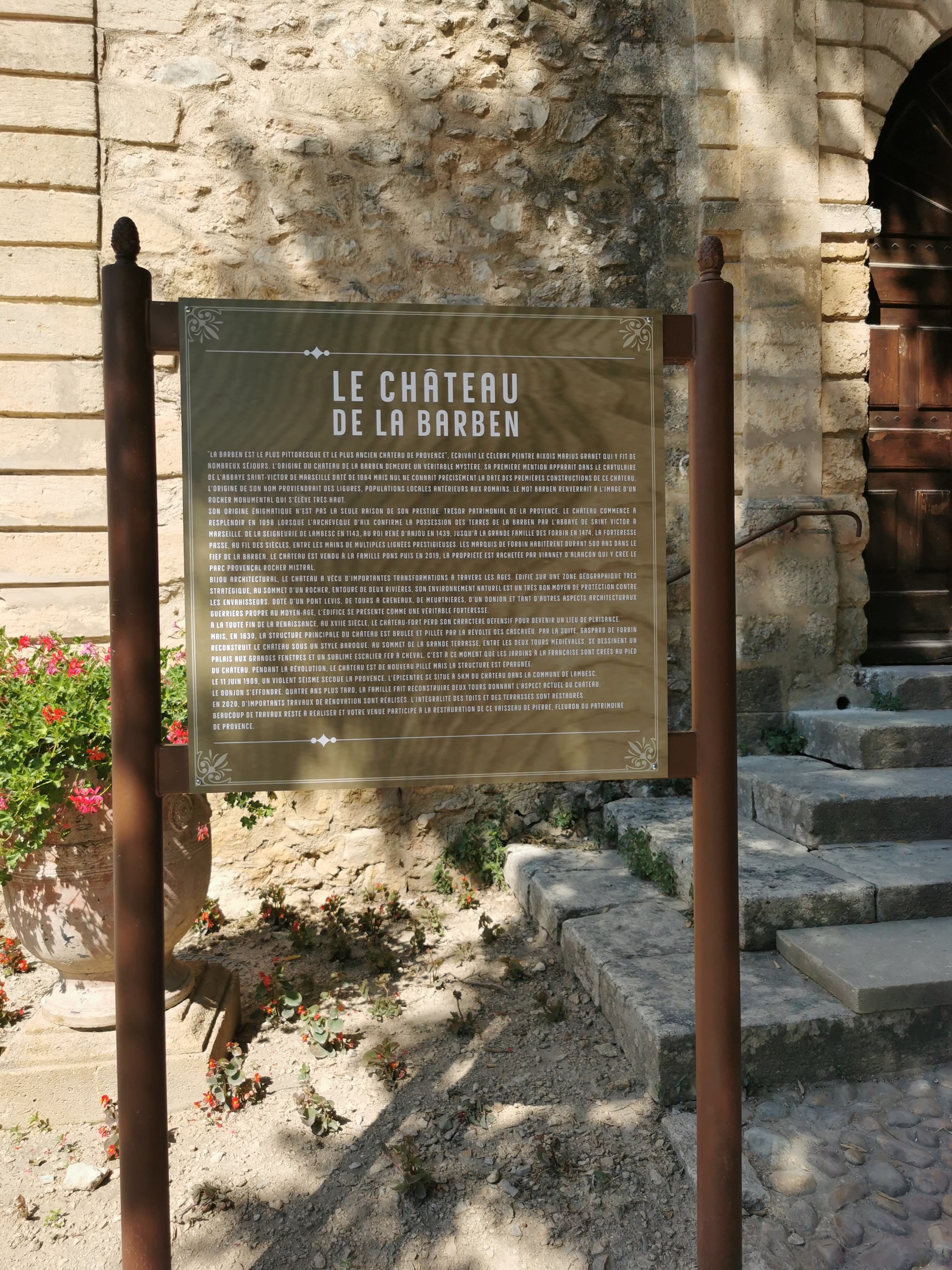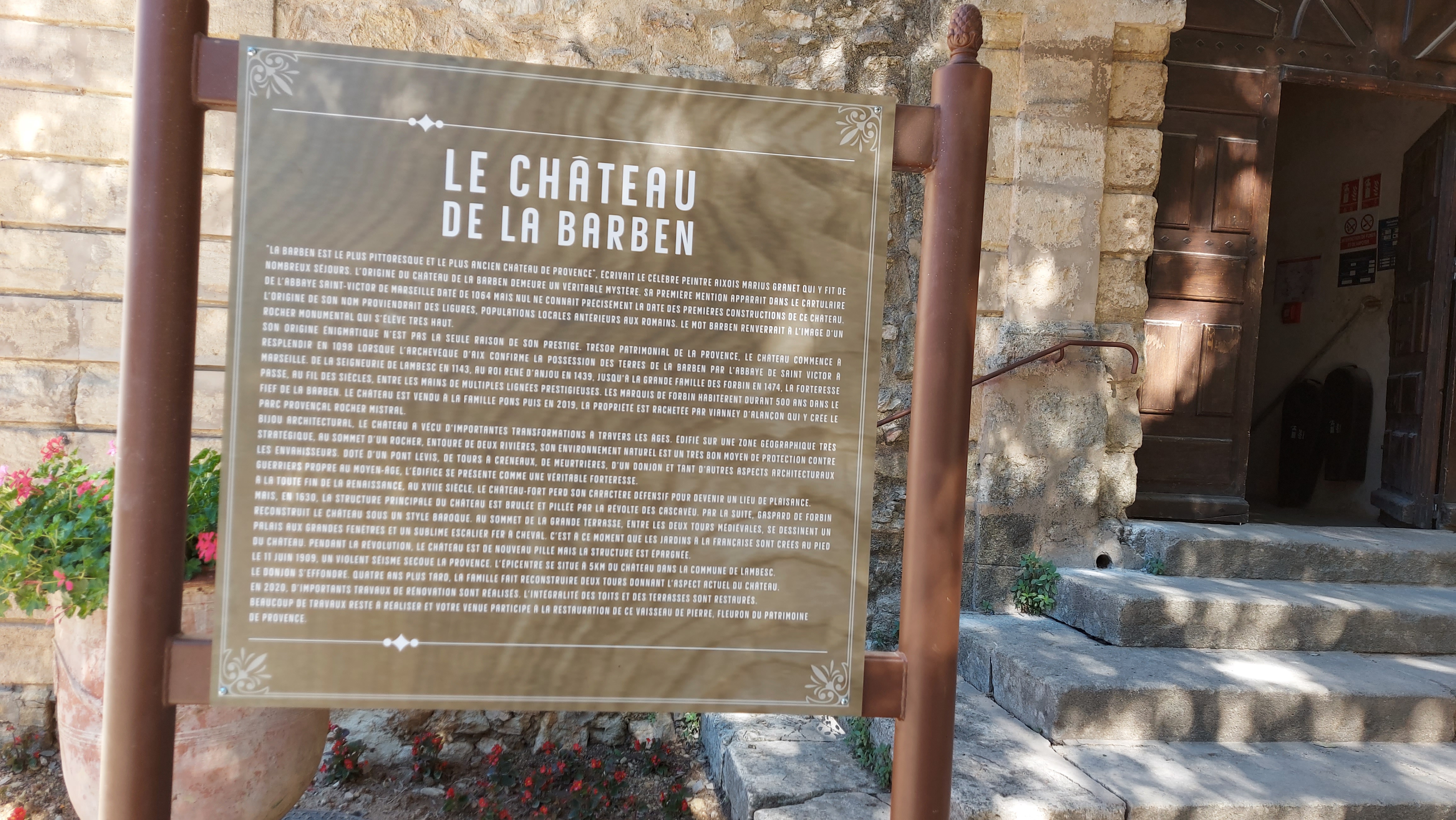 A la Barben, petit village de Provence, culmine un ancien château. Lieu d’histoire, il a su traverser le temps aidé par l’amour de ses occupants qui ont su panser ses plaies: un incendie puis un tremblement de terre. Traversant le temps, changeant de propriétaires et toujours habité, il a gardé son charme d’autrefois. Devenu parc ouvert au public et proposant des spectacles, il ouvre les portes de l’histoire aux plus jeunes. Montre que l’histoire de France est faite de l’histoire et de la culture de ses provinces. Il fait montre pour tous et, venus de toute part, de la richesse du patrimoine matériel et immatériel de la Provence. Ce lieu contribue à la foi à faire vivre le patrimoine d’une manière moderne qui rappelle le puy du fou et contribue également au rayonnement du village de La Barben. Pour être tout à fait honnête je ne l’aurais jamais connu sans cela. Je ne suis pas fan des attractions historiques en principe mais le parc a réussi un mélange équilibré qui m’a transporté et fait rêver. Une belle sortie en famille
