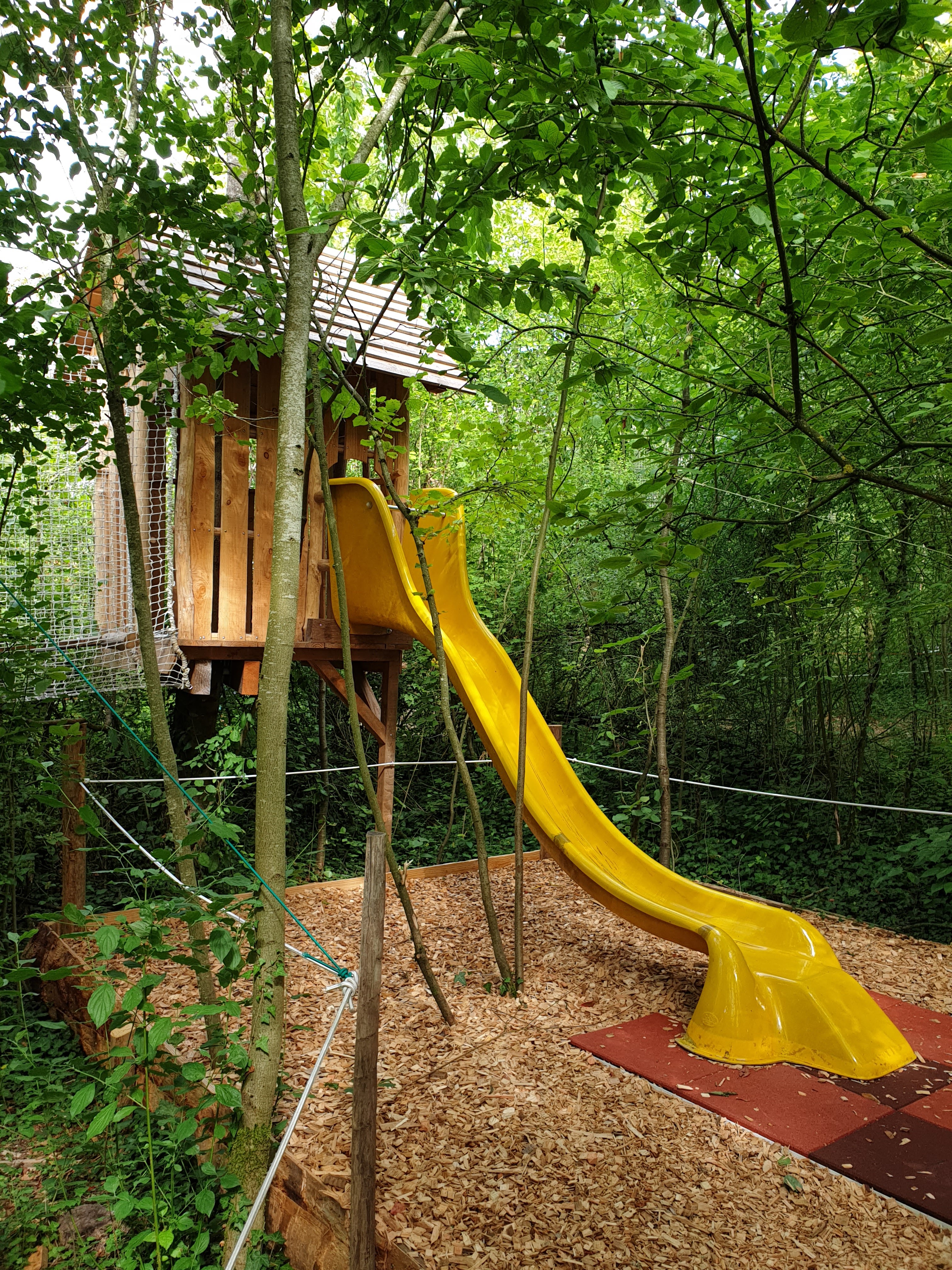 Concept sympa, notamment pour les enfants avec un parcours entièrement protégé avec filet, piscine a boules suspendu et parcours avec plusieurs sortes de tyroliennes, dans un endroit calme et personnels sympathique